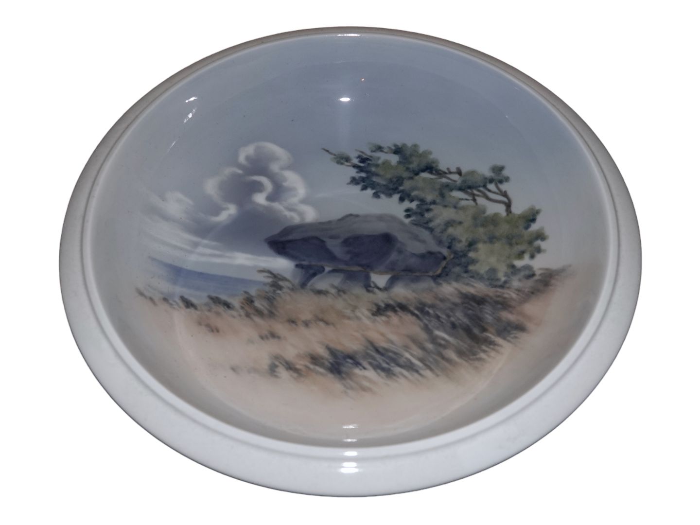 Stor Royal Copenhagen rund skål med landskab.