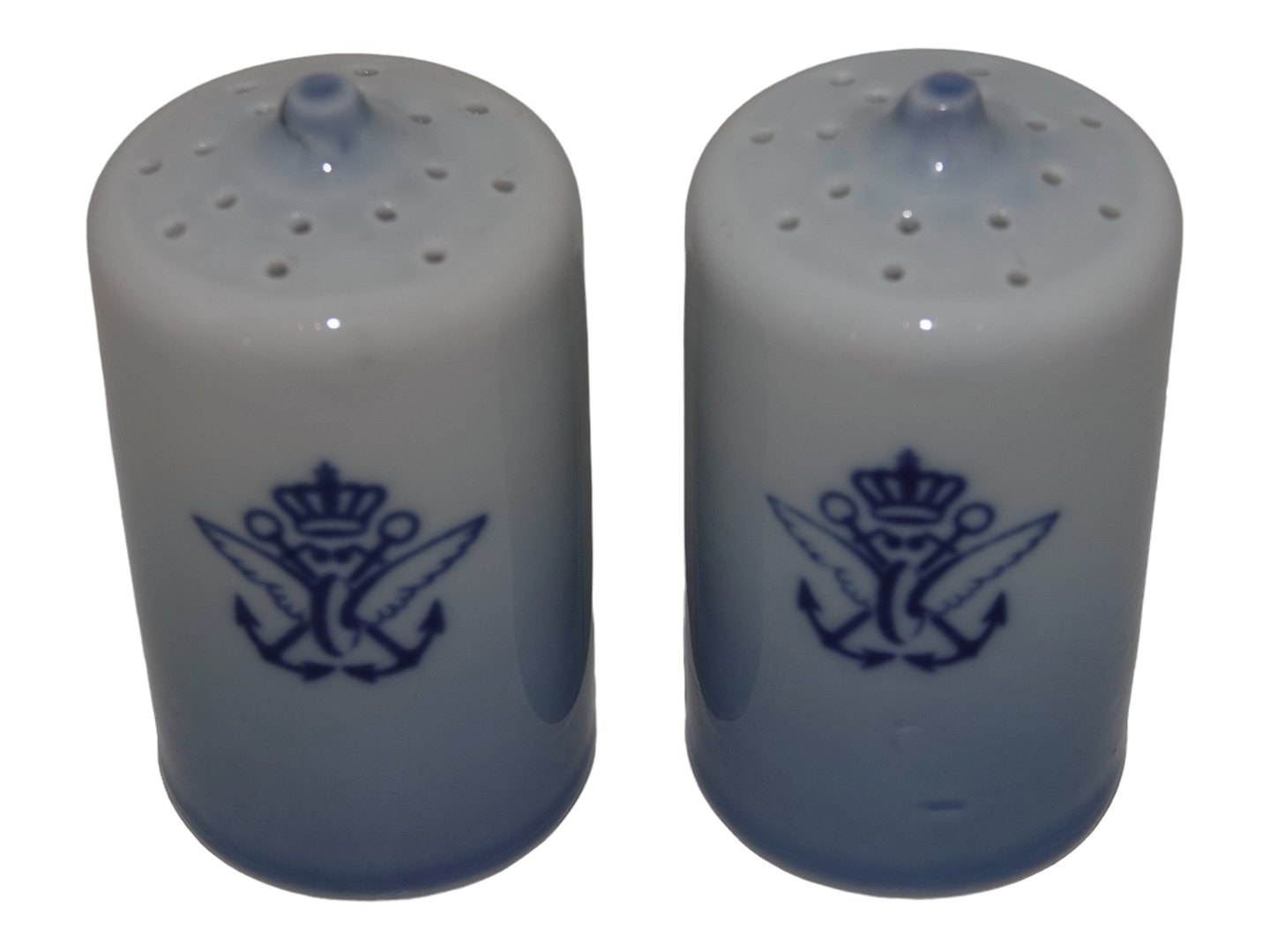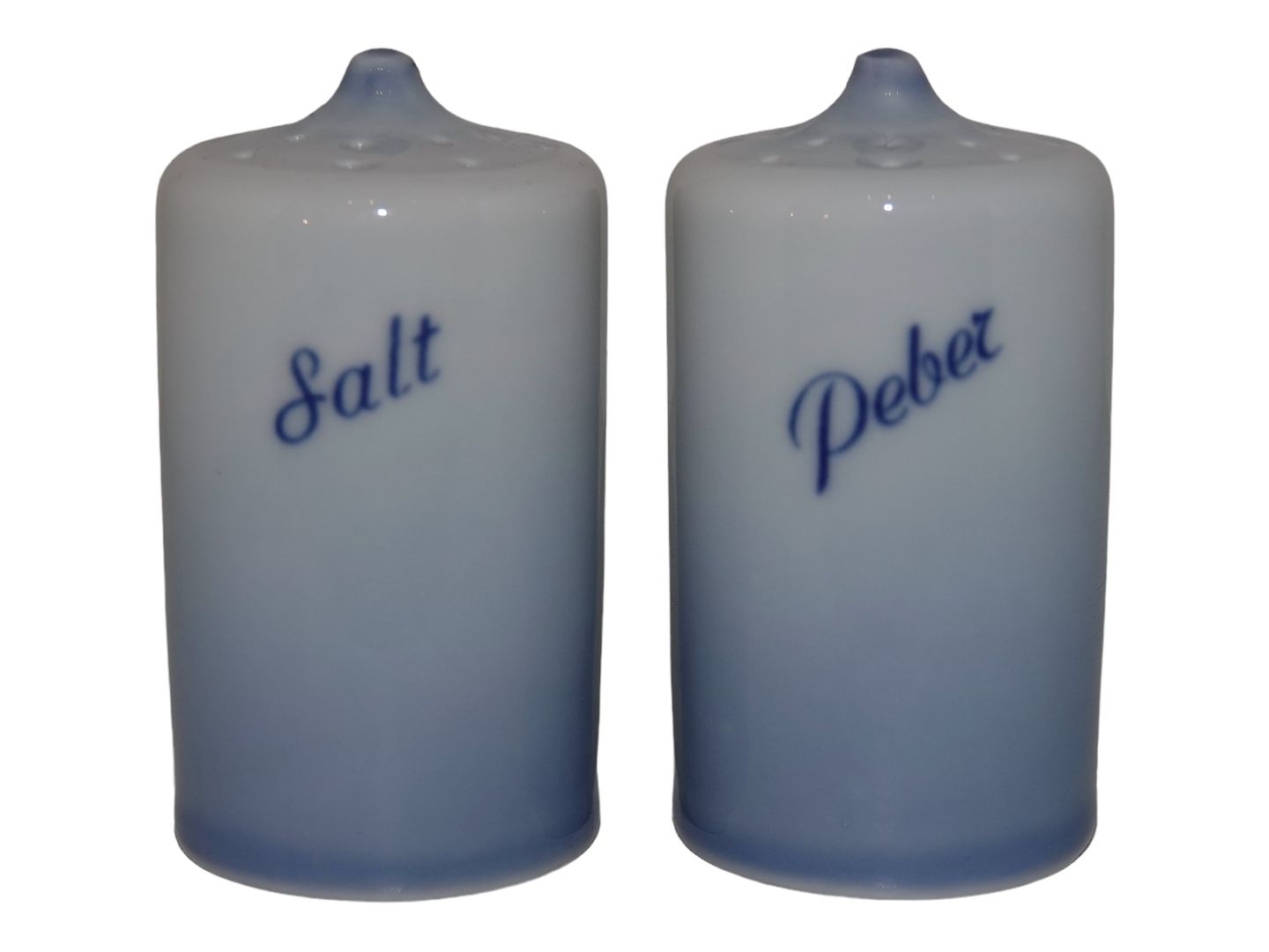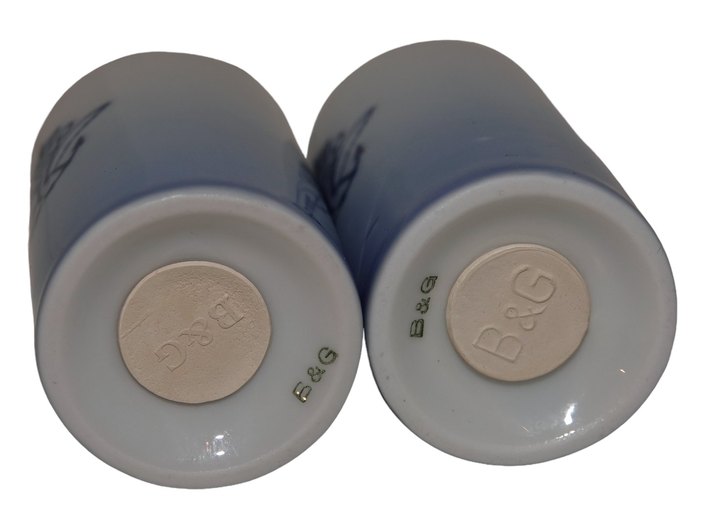 Bing & Grøndahl Blå Tone Jernporcelæn, saltbøsse og peberbøsse med logo.