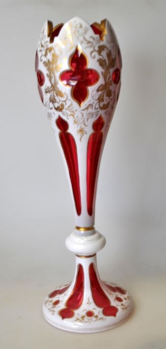 Bøhmisk jugend vase i rødt glas med hvidt overfang, ca. 1900. Med slibninger og forgyldninger.Forgyldninger i form af bladværk. H.: 30 cm.