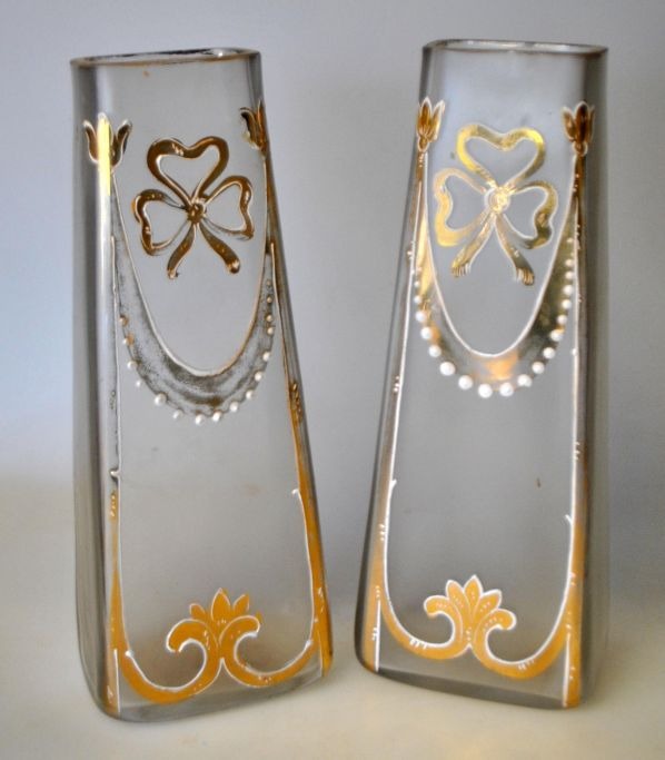 Et par tyske jugend vaser, 1900. Matteret glas med dekorationer i emalje maling og forgyldning. H,; 21,5 cm.