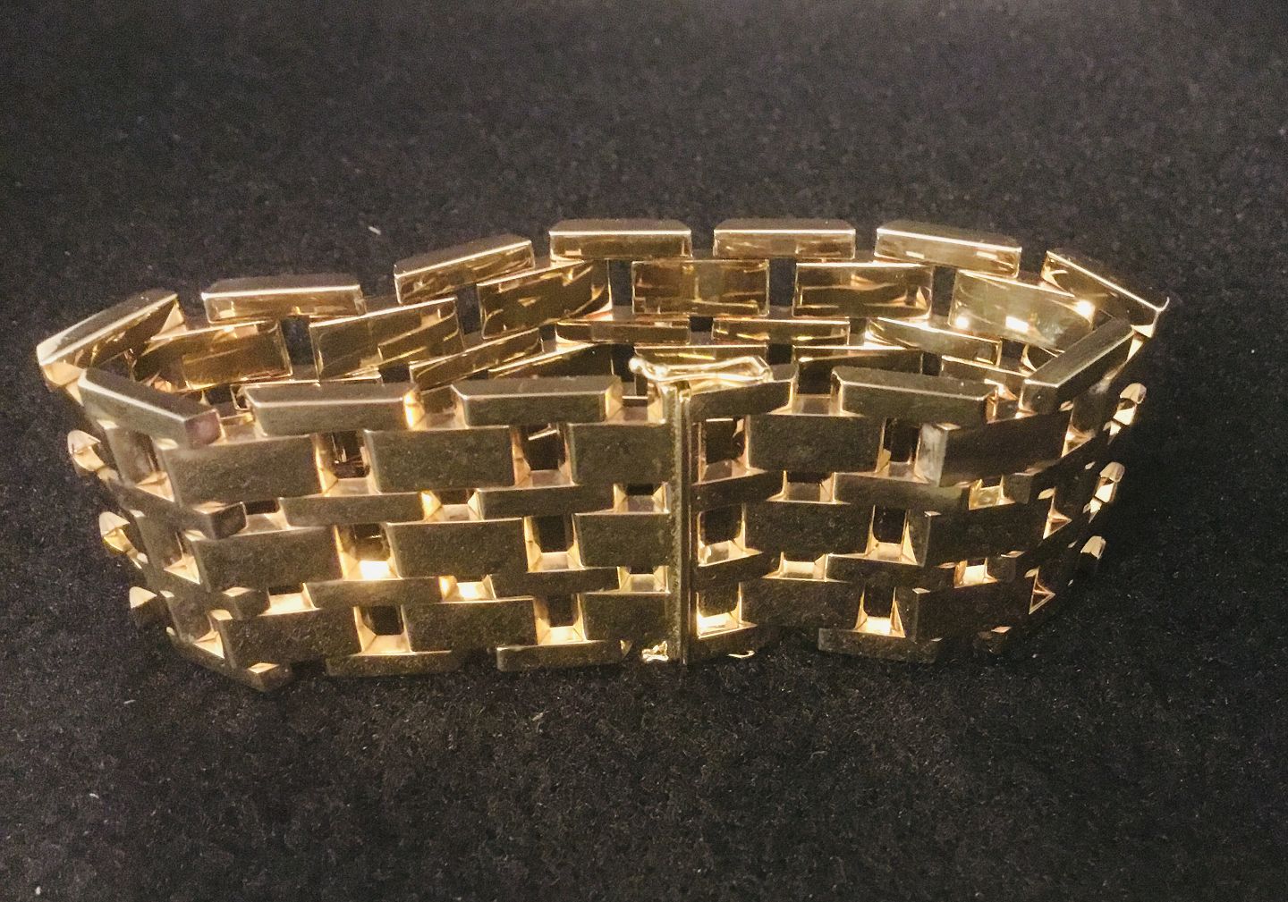 Kraftig Blokarmbånd i 14 K guld, B 31 mm, L 20,3 cm, monteret med kasselås og to sikkerhedslåse, i meget fin stand.