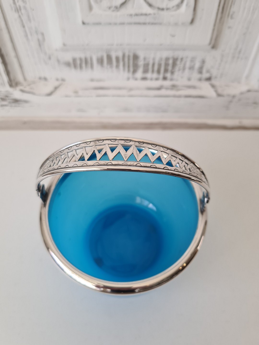 1800tals sukkerskål i lyseblå opalineglas med forsølvet hank.