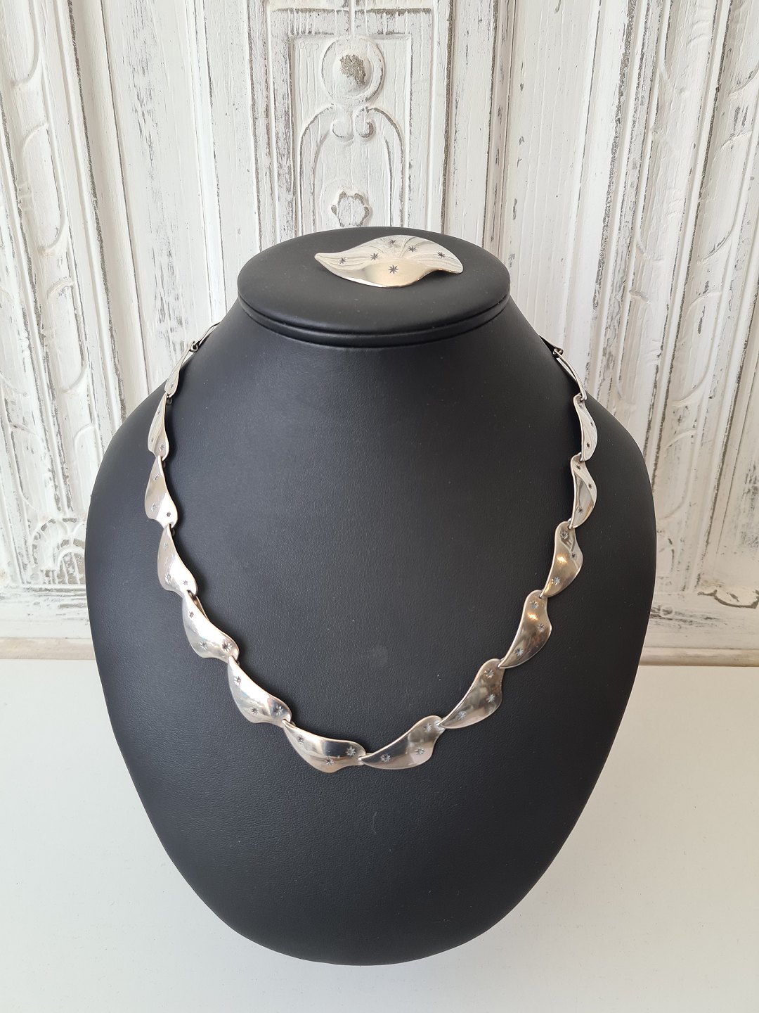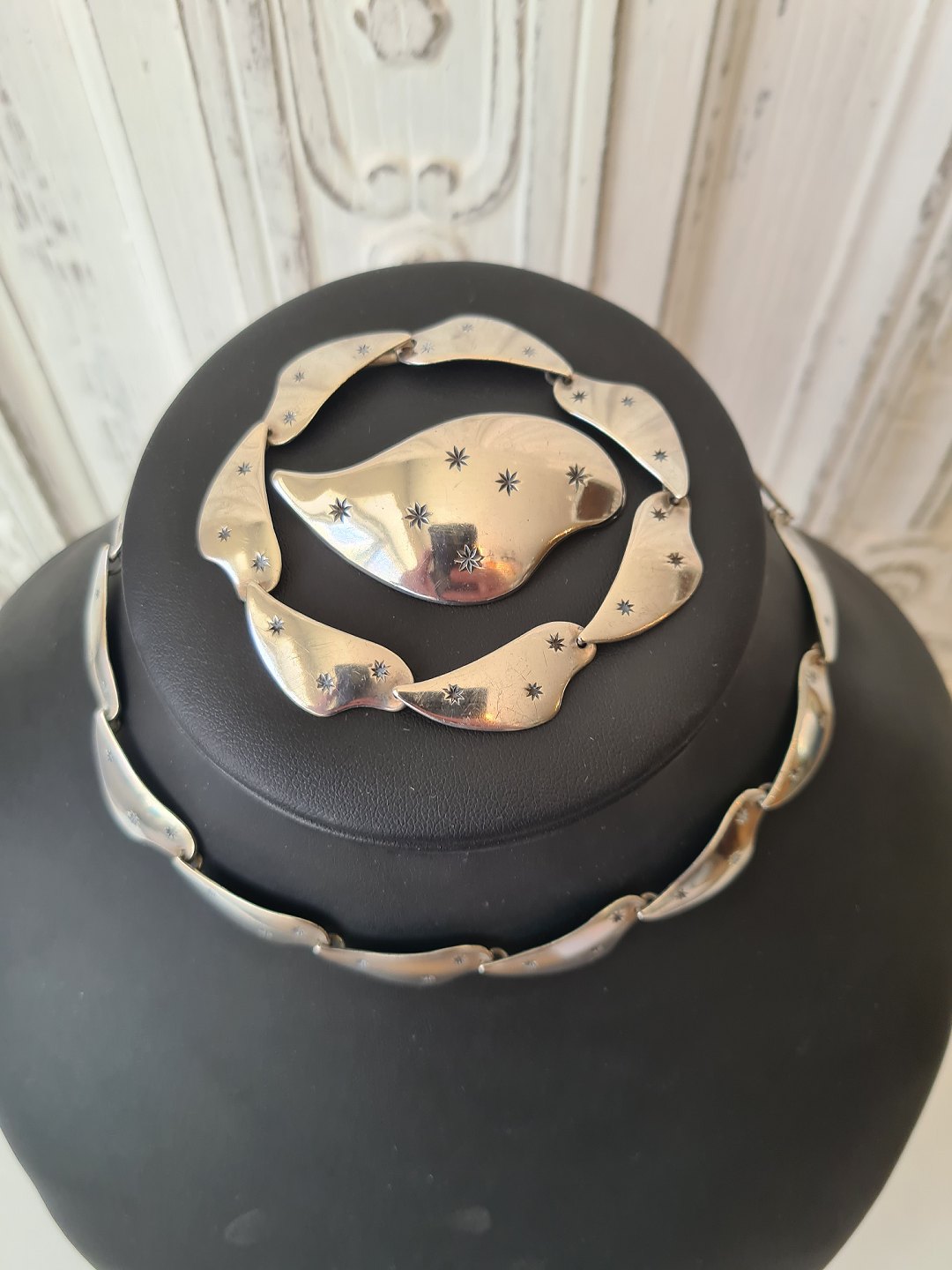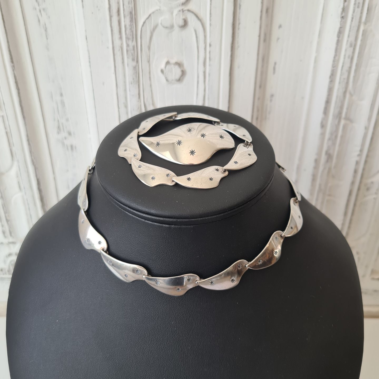Smykke sæt bestående af halskæde, armbånd og broche udført i sterlingsølv prydet med stjerner i sort emalje. Halskæden og armbåndet kan sættes sammen til en lang halskæde.