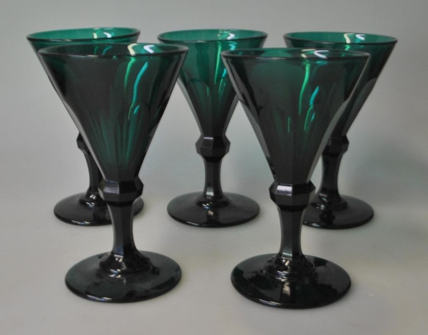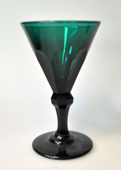 Green white wine glass of the Anglais type, 19th century. Dark green glass. With grindings and octagon-shaped knots on stem. H.: 12.5 cm.
