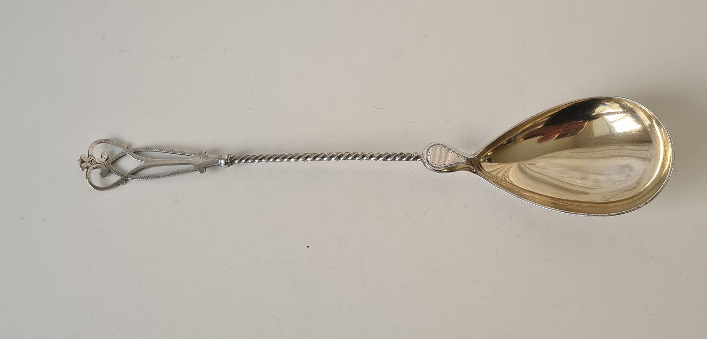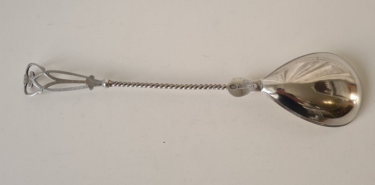 Large silver serving spoon made in New Gothic style from 1883 by J. Grønlund