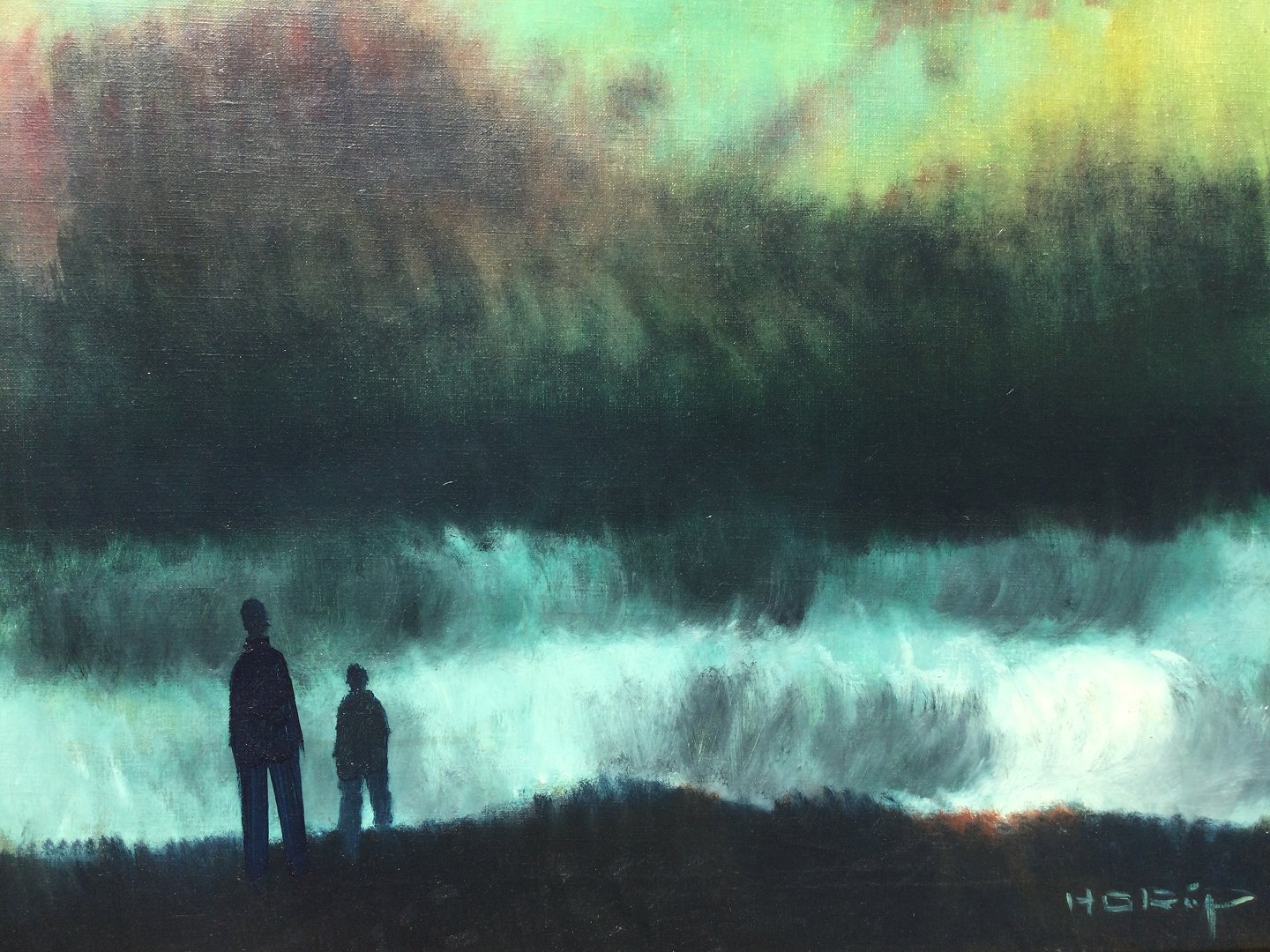 Maleri af Knud Horup - Personer ved oprørt hav.