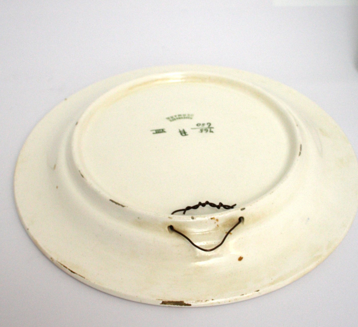 Text available in Danish: Aluminia, juleplatte 1910. Nr. 765/650. Motiv i relief: 3 engle der ringer med klokker. Designet af Rasmus Harboe. Diameter 30 cm. Højde 3 cm. Flot stand med begrænset overfladekrakelering og glasurafslag på bagsiden. Pris: 975 kr. stk. Lager: 1