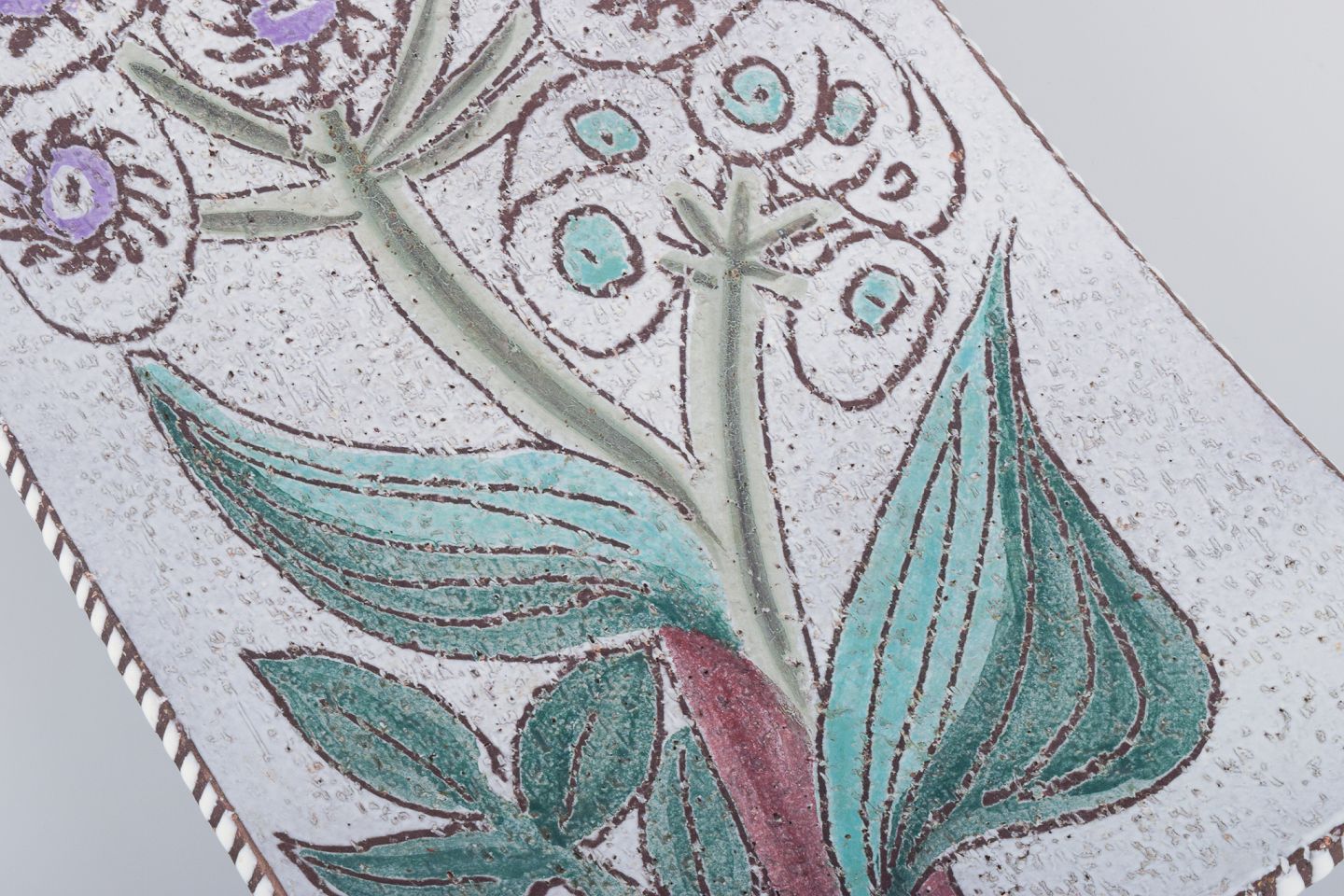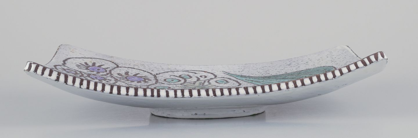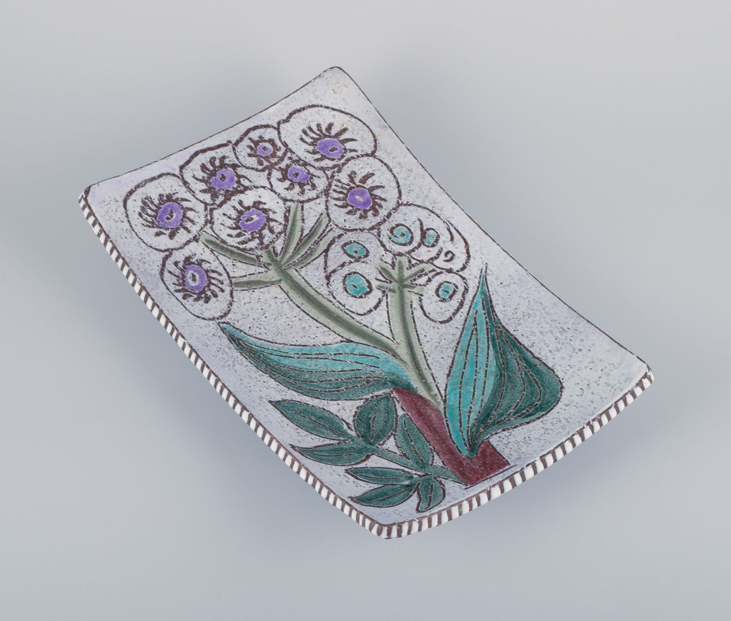 Mari Simmulson for Upsala Ekeby, Sverige. Stort aflangt fad på fod. Blomstermotiv i retrostil.