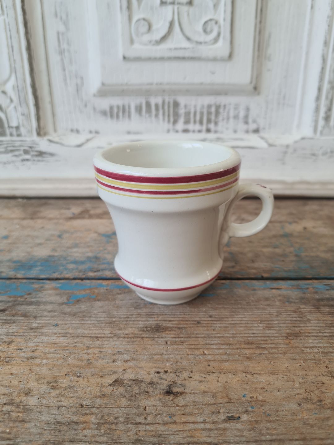 Fransk café brûlot kop i kraftigt jern porcelæn dekoreret med røde og gule striber.