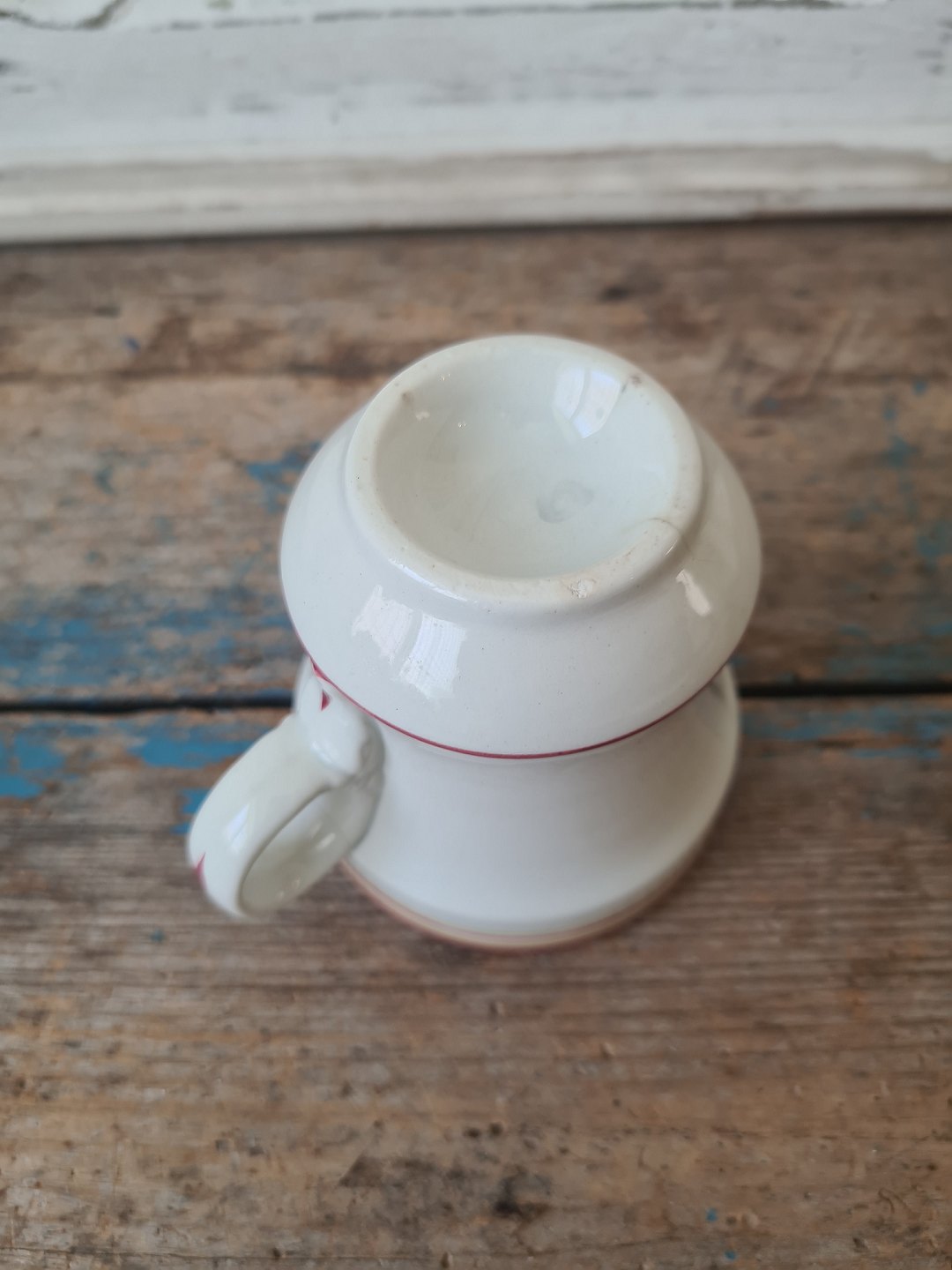 Fransk café brûlot kop i kraftigt jern porcelæn dekoreret med røde og gule striber