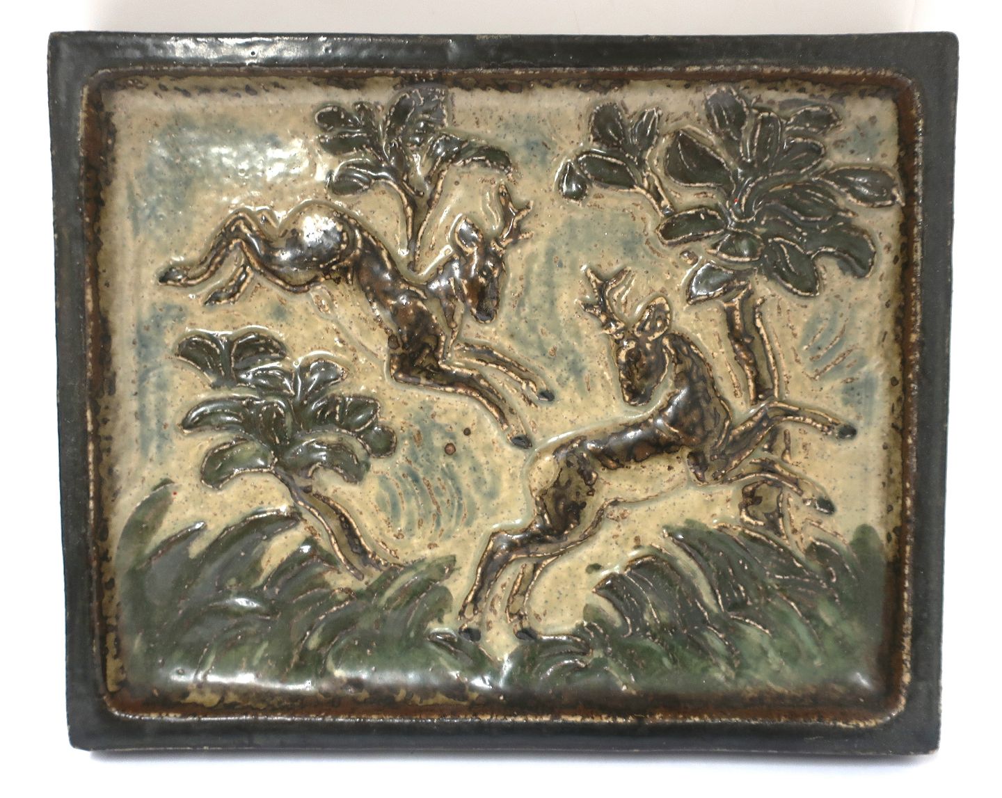 Royal Copenhagen. Stentøjsrelief med rådyr. Design Knud Kyhn. Længde 28 cm. Bredde 22,5 cm. (1 sortering)