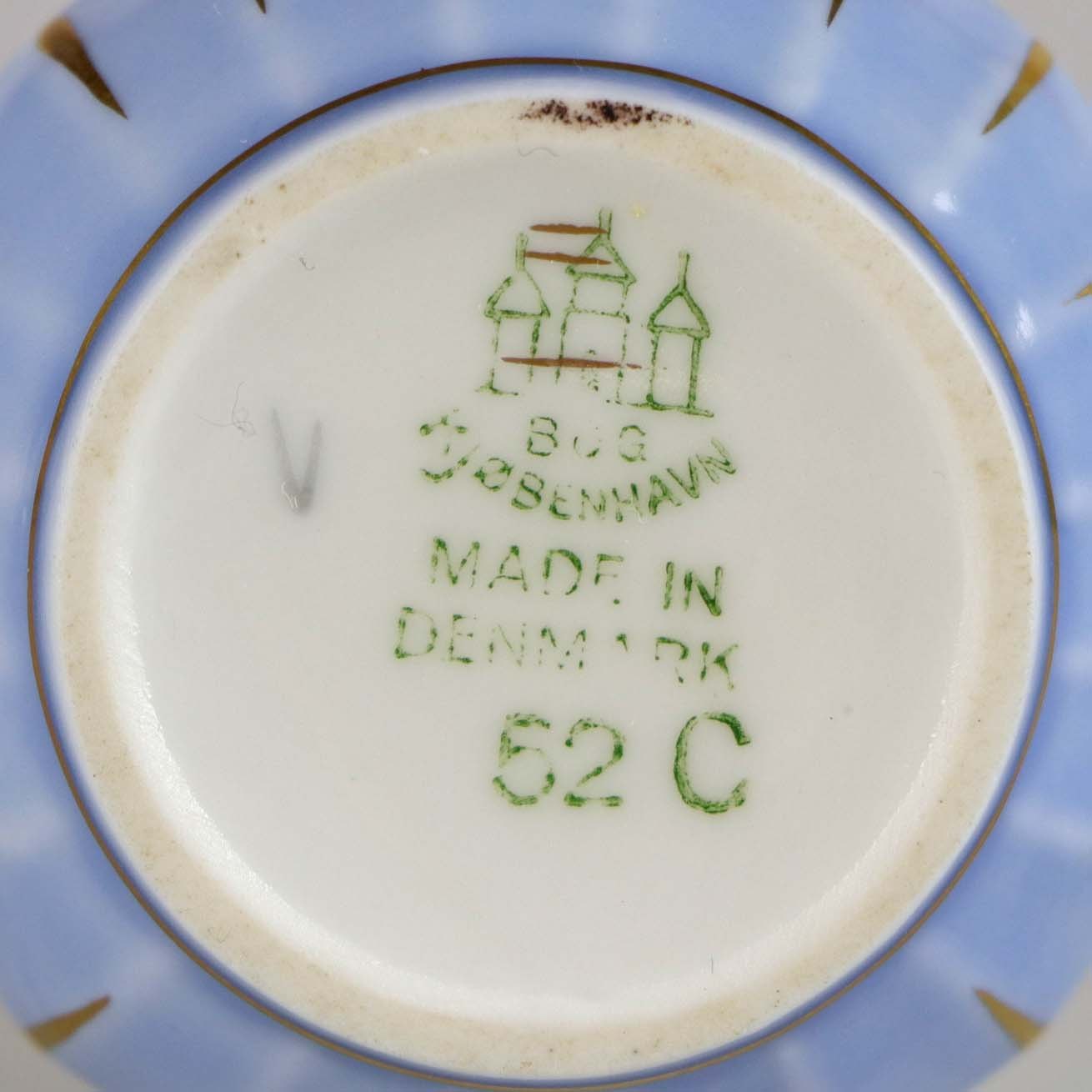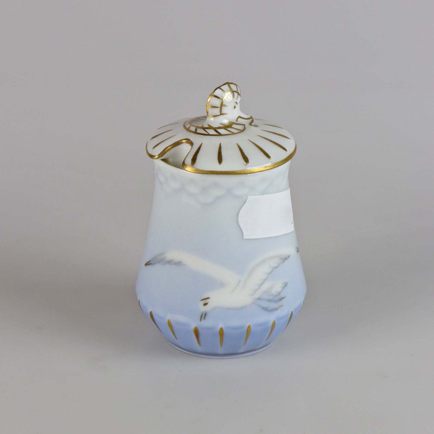 Krukke af porcelæn i blålige farver med motiv af måger og guldkant
