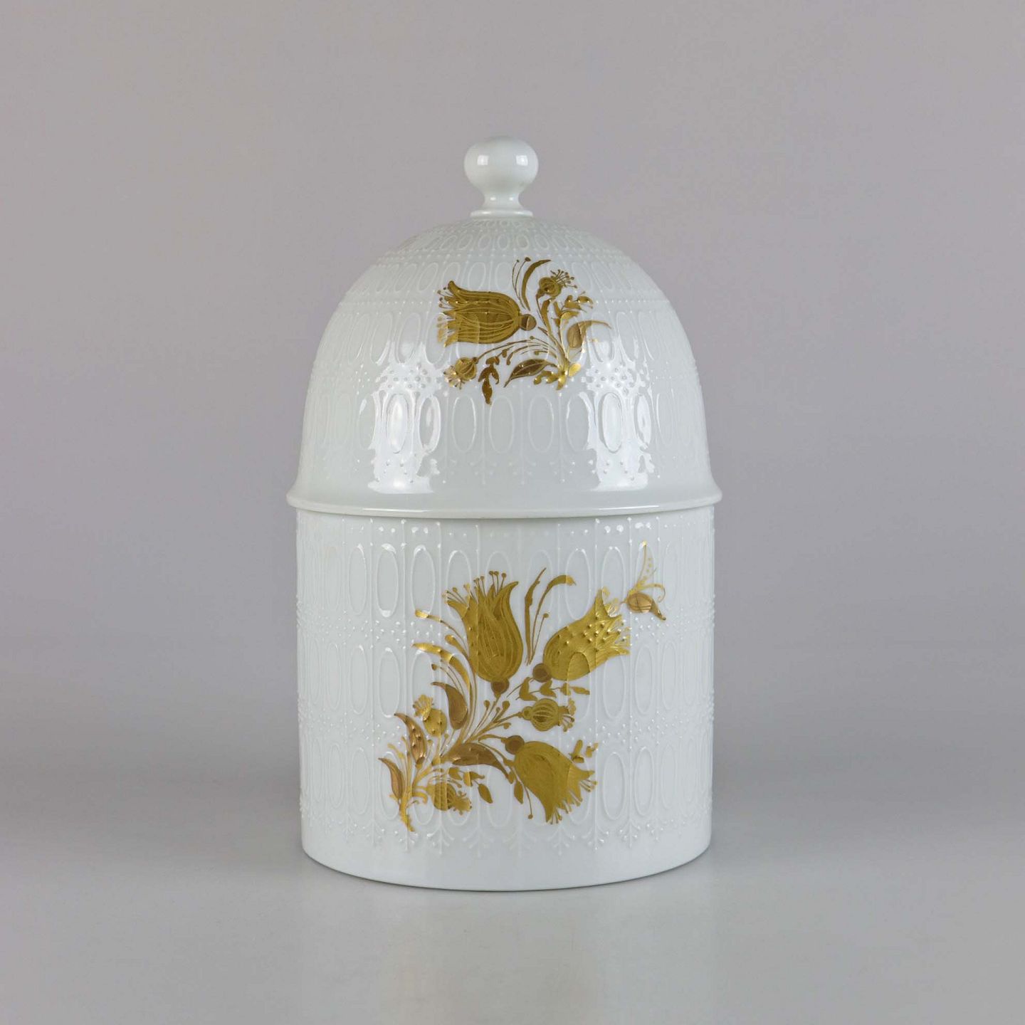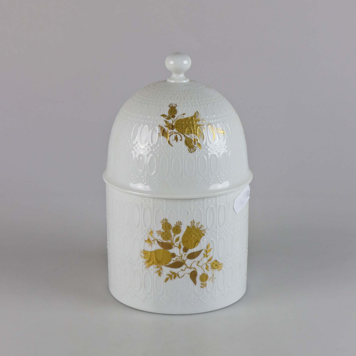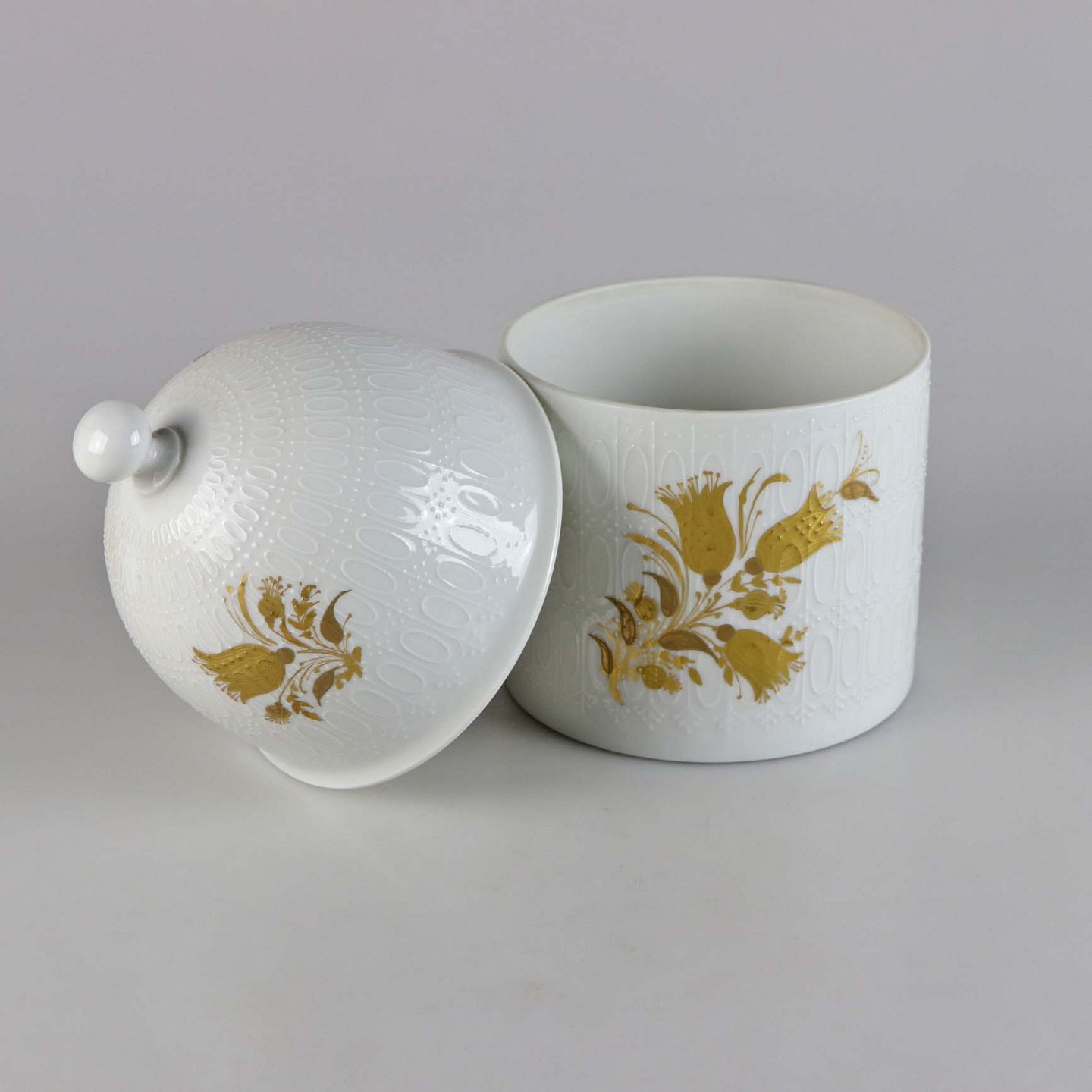 Text available in Danish: Krukke med låg fra stellet Romanze. Krukken er lavet i forbindelse med Rosenthal's 100 års jubilæum