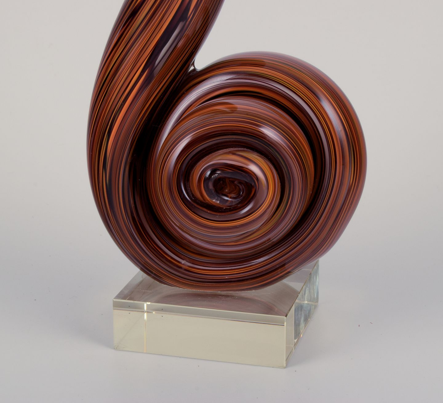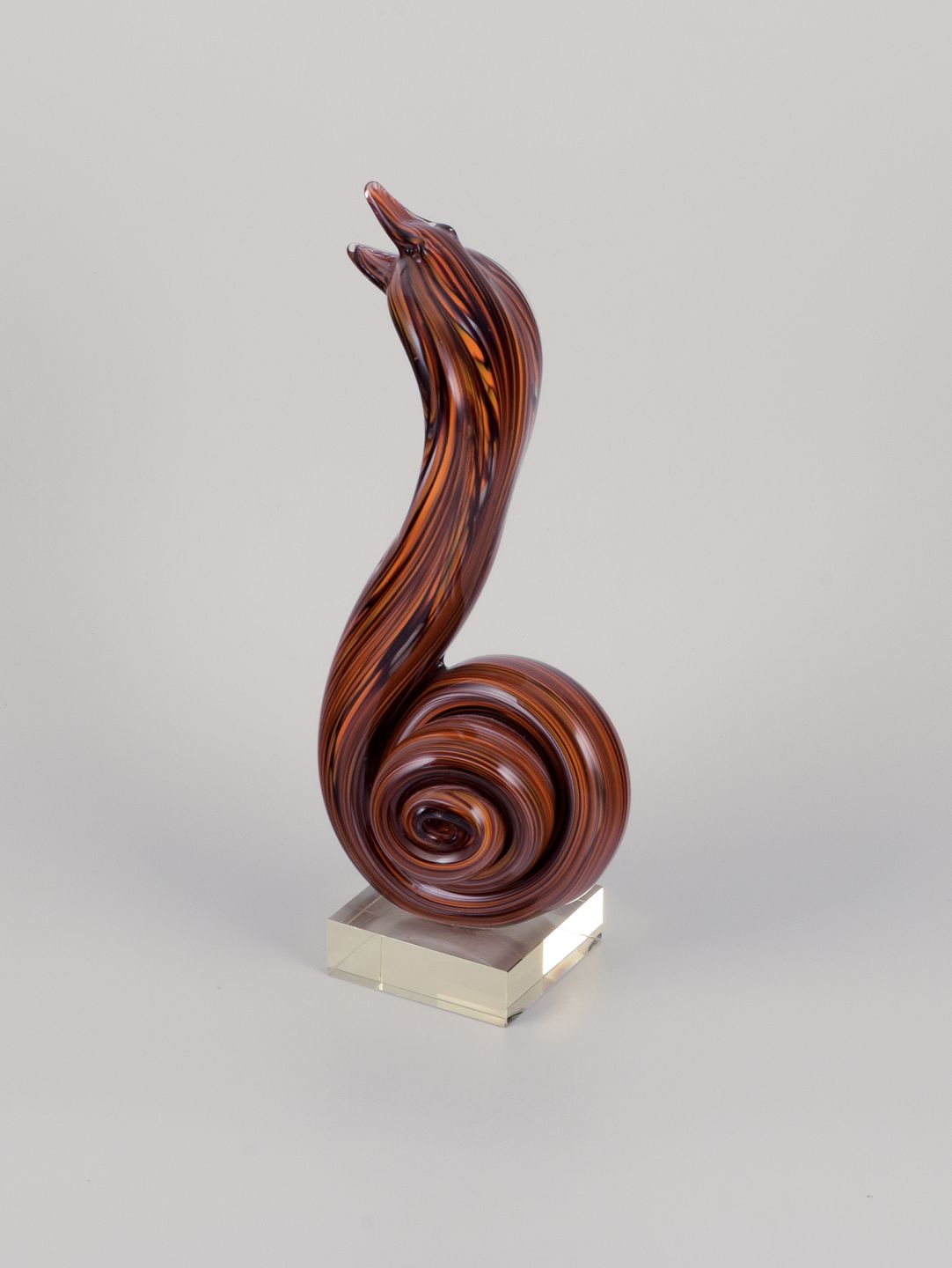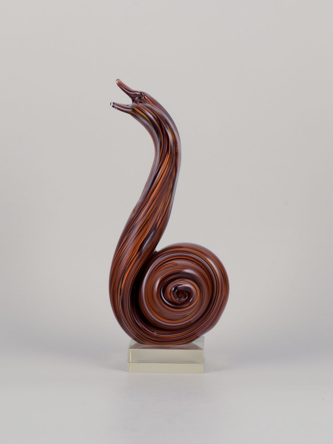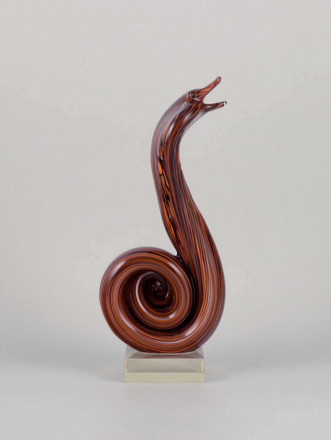 Murano, Italien. Stor skulptur forestillende kobraslange udført i kunstglas. Glas i brune og orange toner. På base af klart glas.