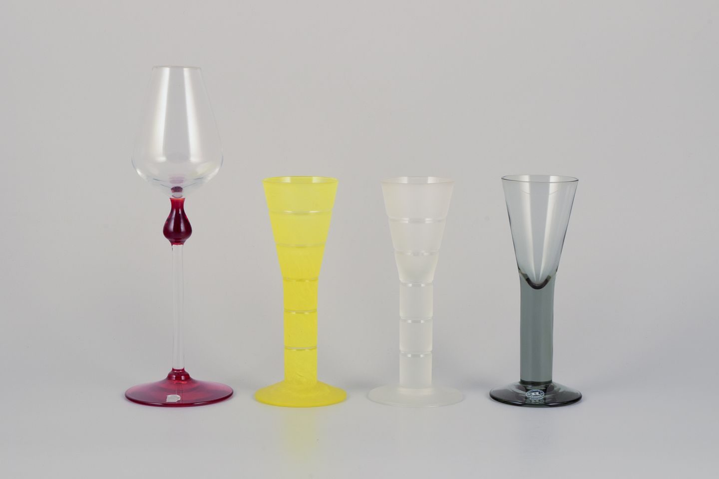 M. Hennix for Reijmyre, Sverige. Et sæt på tre snapseglas samt et højt og slankt likørglas. Håndlavet og mundblæst kunstglas. Forskelligfarvet.
