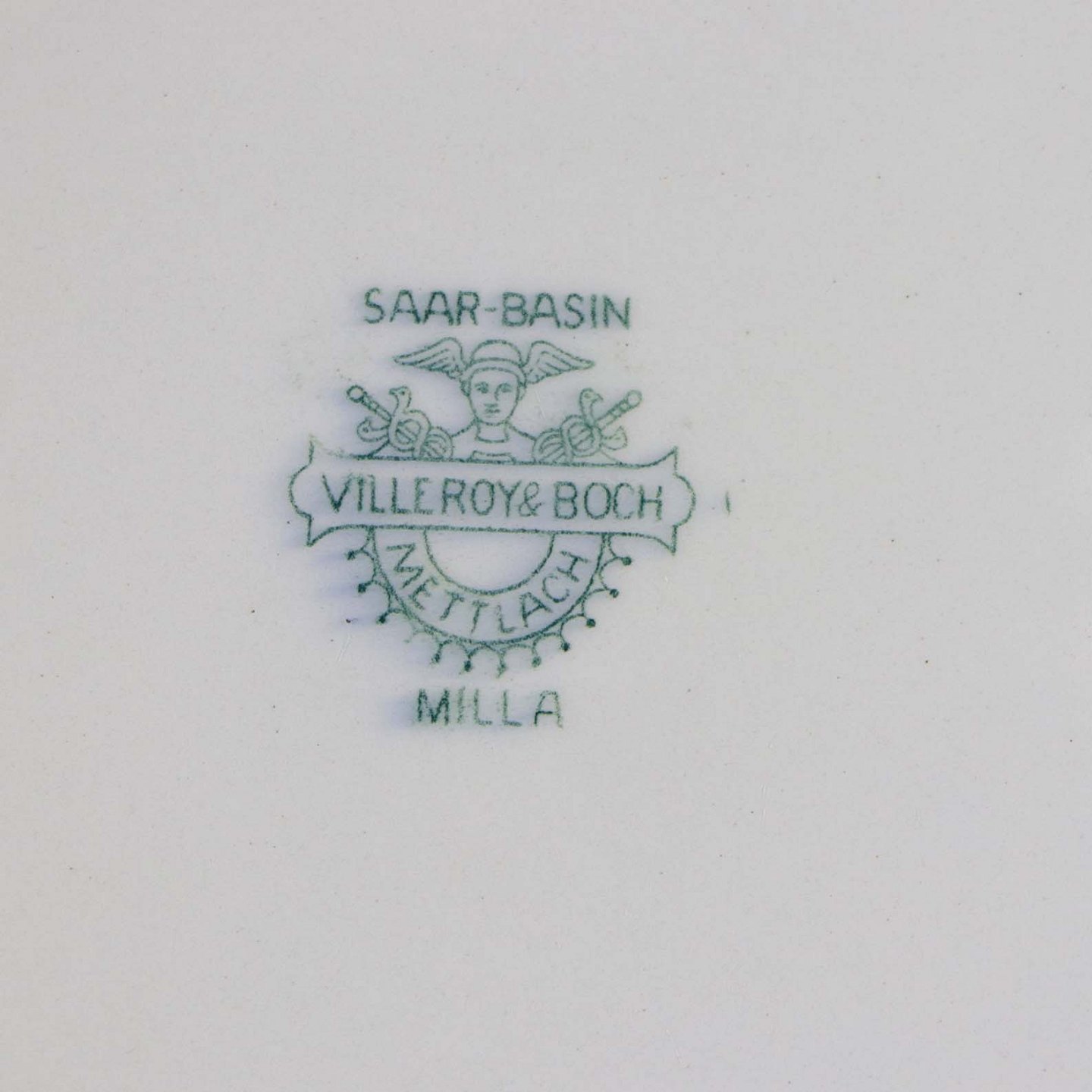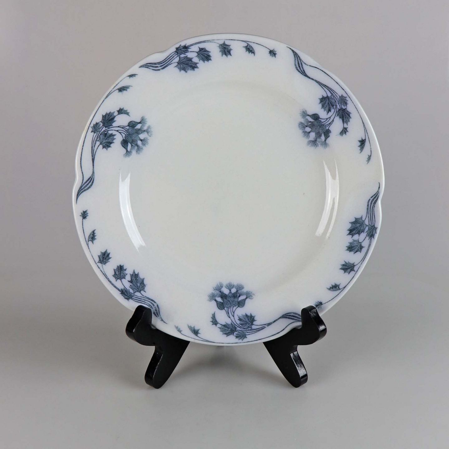 Stellet Tidsel er tysk og er lavet i fajance. Stellet er hvidt og dekoreret med en ranke af blade og en tidsel i grå blå farver