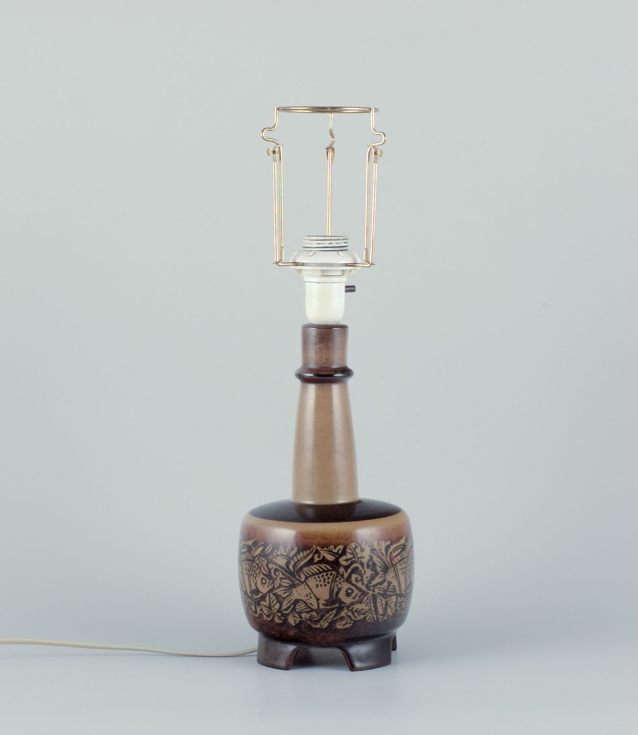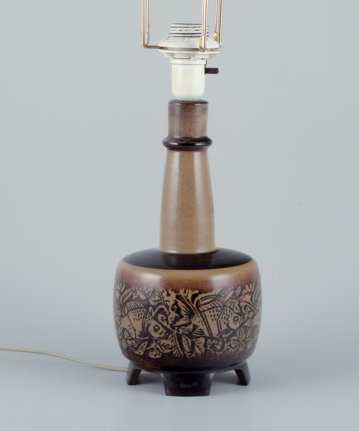 Nils Thorsson for Royal Copenhagen. Bordlampe i stentøj med motiv af svømmende fisk. Glasur i brune toner.