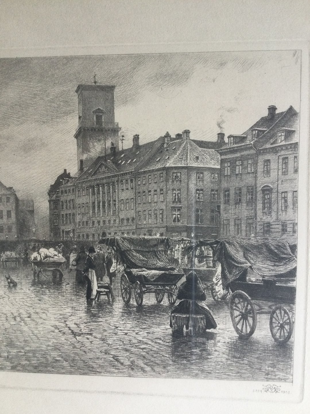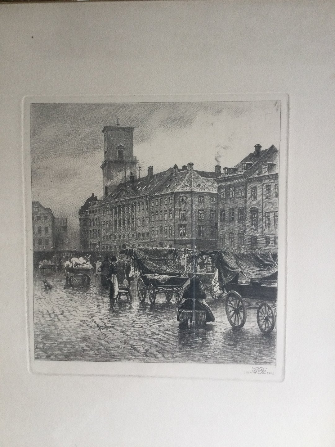 Radering af Peter Tom-Petersen - Nytorv i København med slagtervogne og Vor Frue Kirkes Tårn 1905.