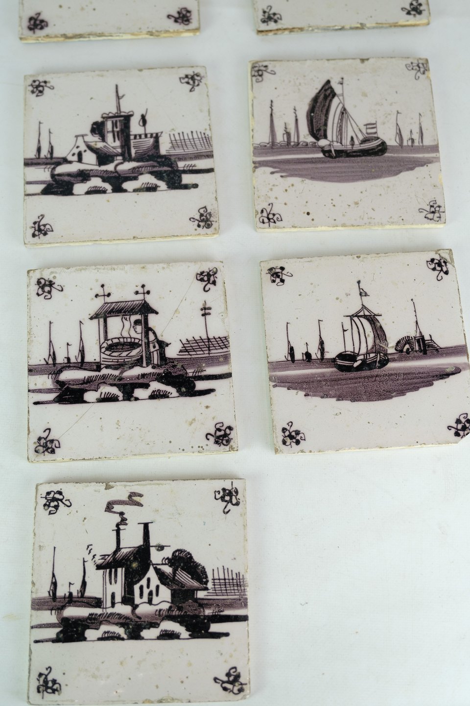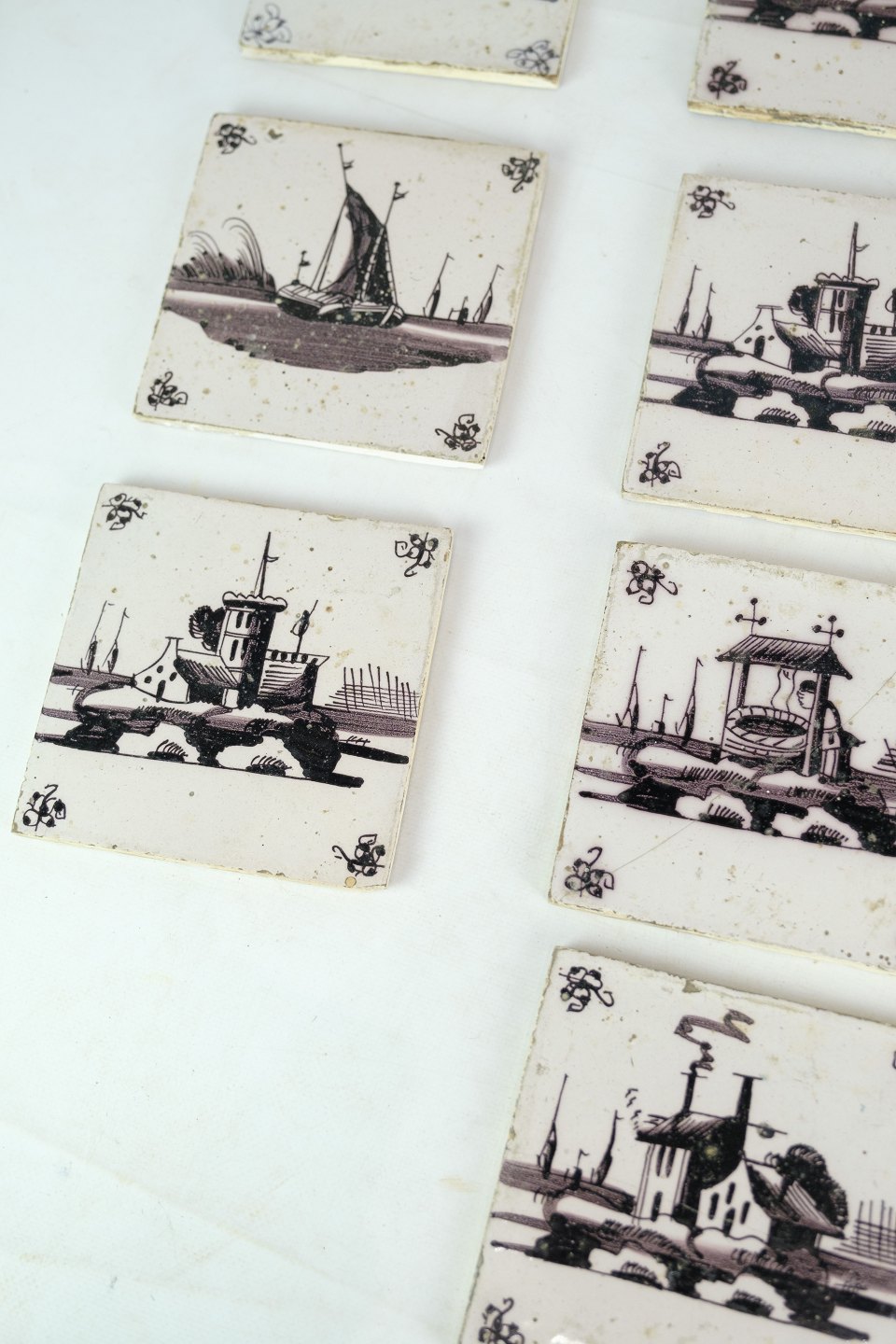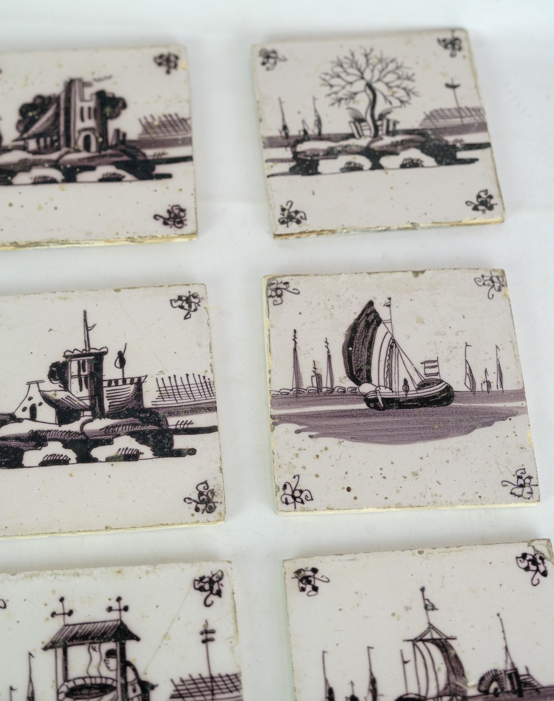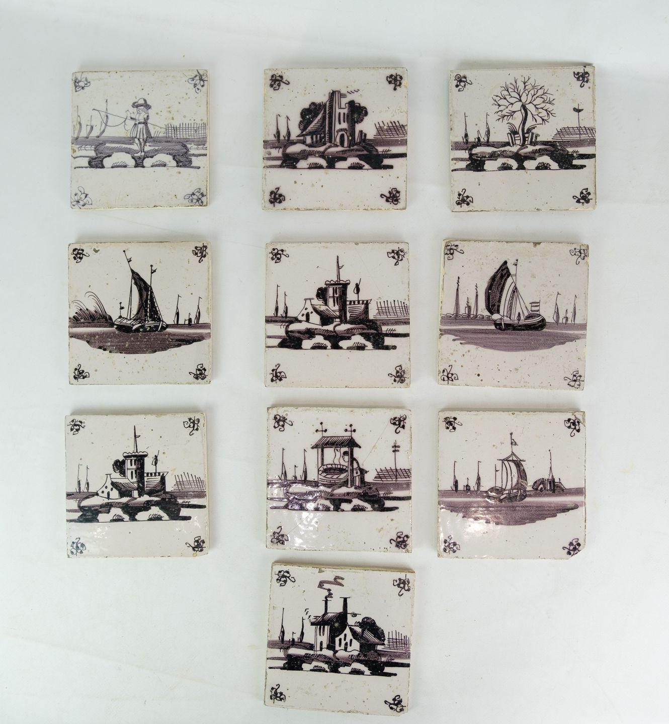 Et sæt af 10 antikke hollandske Delft-manganlilla keramikfliser fra 1800-tallet. Delft-keramikken, også kendt som Delftware, er kendt for sin blå og hvide dekoration, der blev inspireret af kinesisk porcelæn, og det var meget populært i Holland i det 17. og 18. århundrede.
