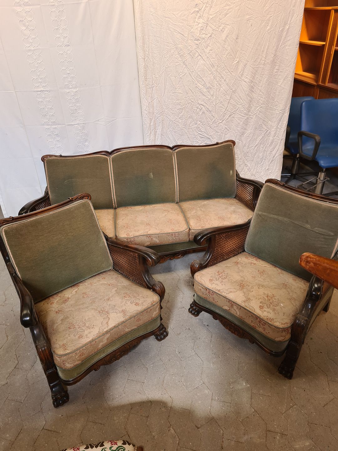 Sofa og 2 lænestole i nødetræ med rørflet, fra 1930erne.