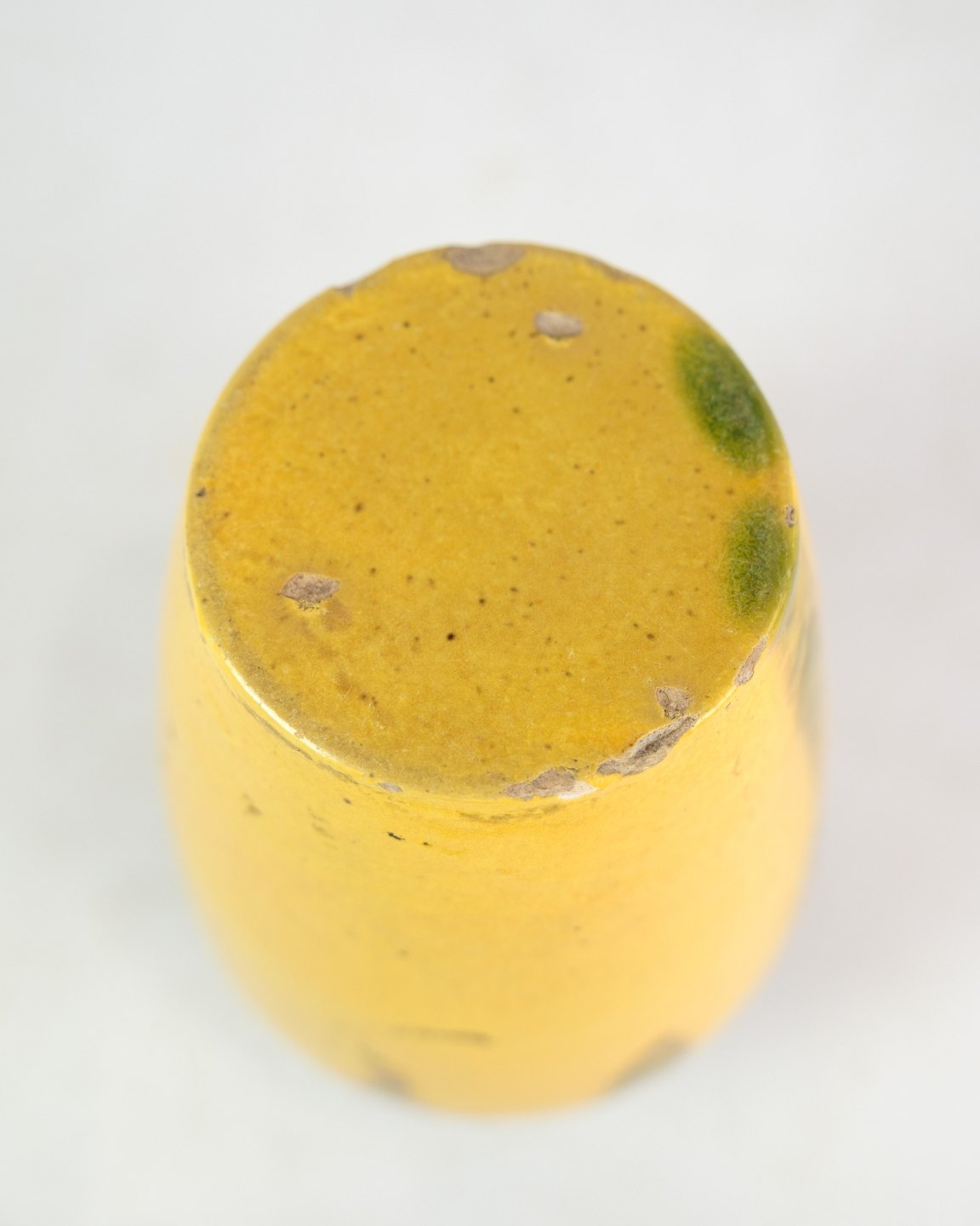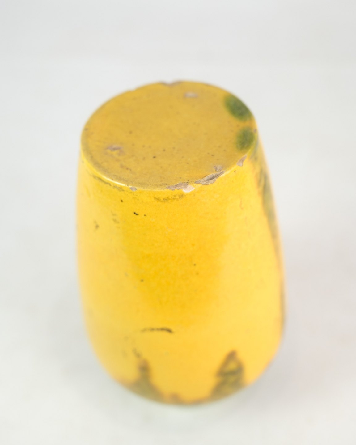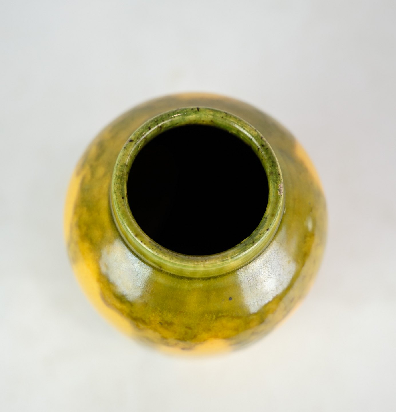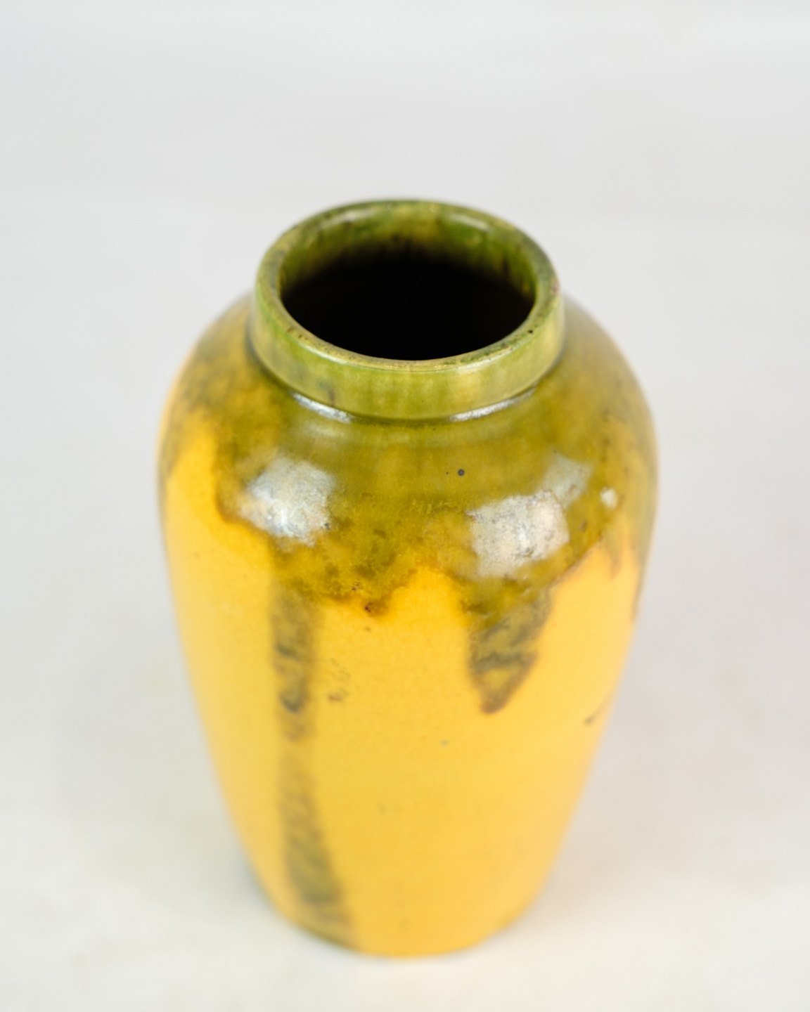 Keramik vase med gul og grønlig glassur fra omkring 1960'erne.