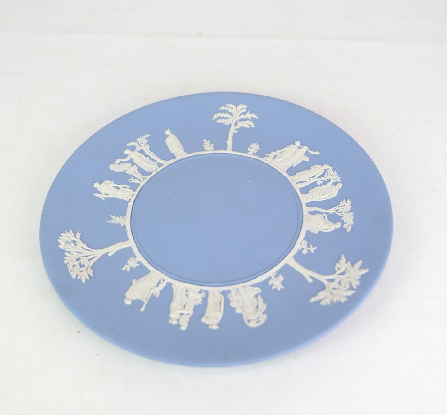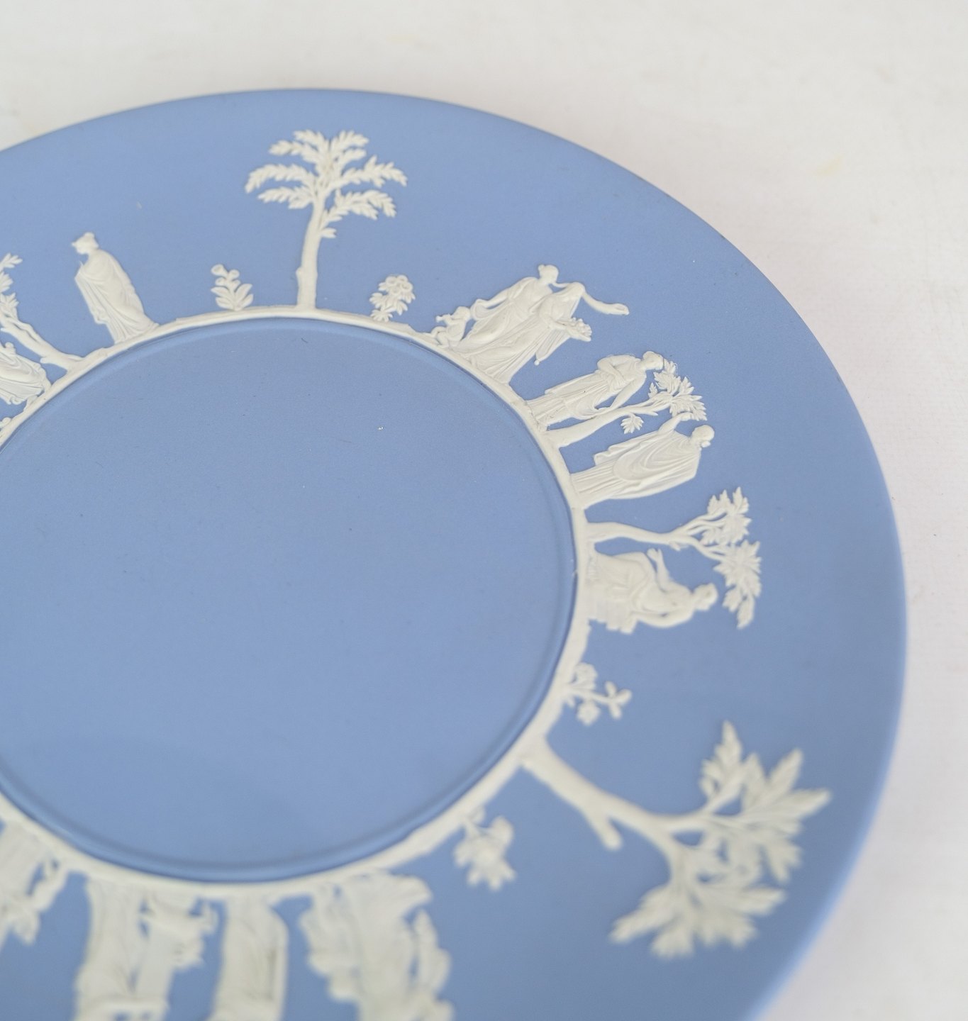 Wedgwood keramik tallerken jasperware creme farve i motivet og baggrundsfarven er lyseblå.