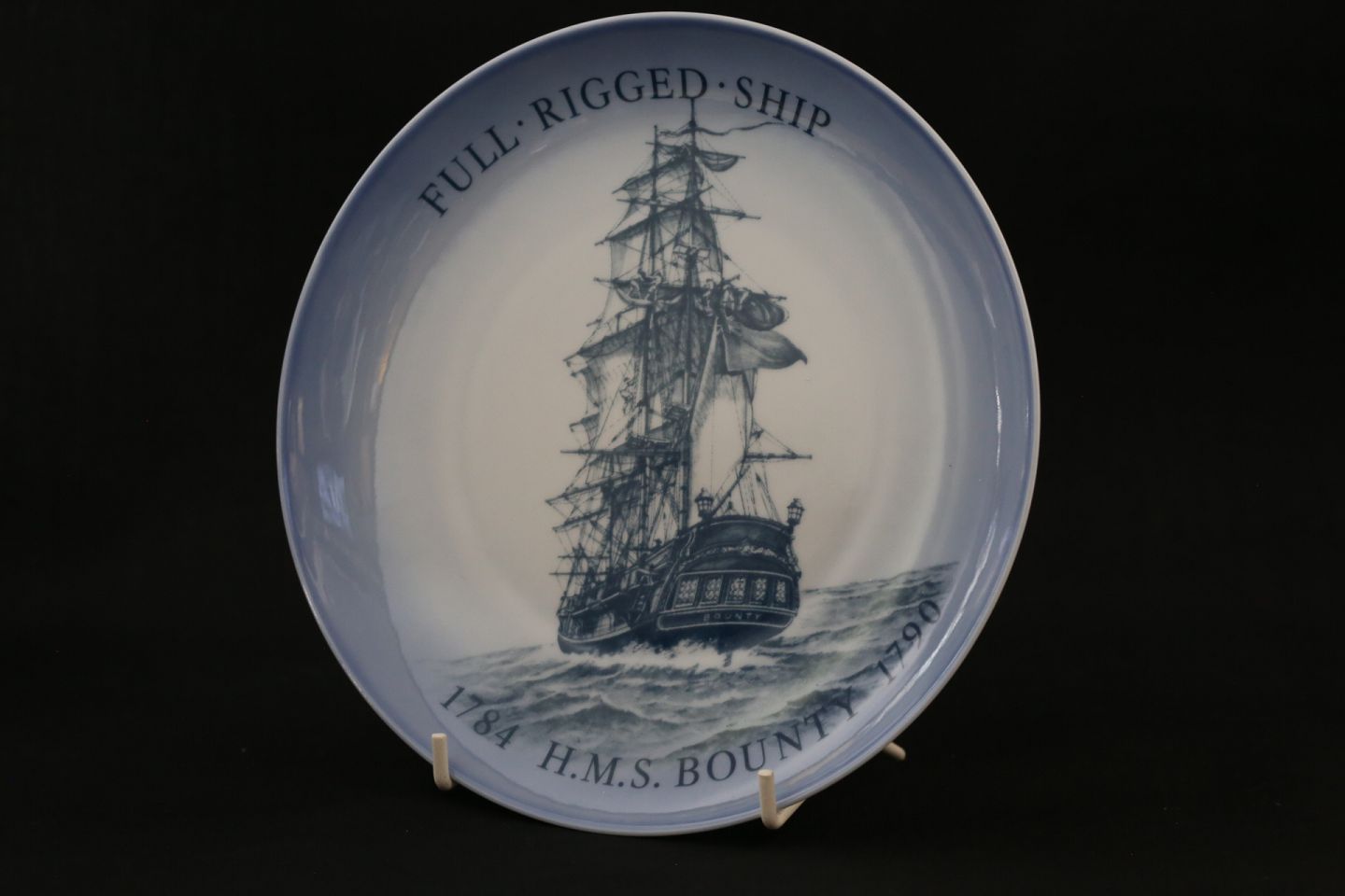 Skibsplatte Bing & Grøndal, No. 5, fra 1983. Platten er bemalet med Full Rigged Ship, med teksten 1784 H.M.S. Bounty 1790. Der er tekst om skibet på bagsiden af platten.
