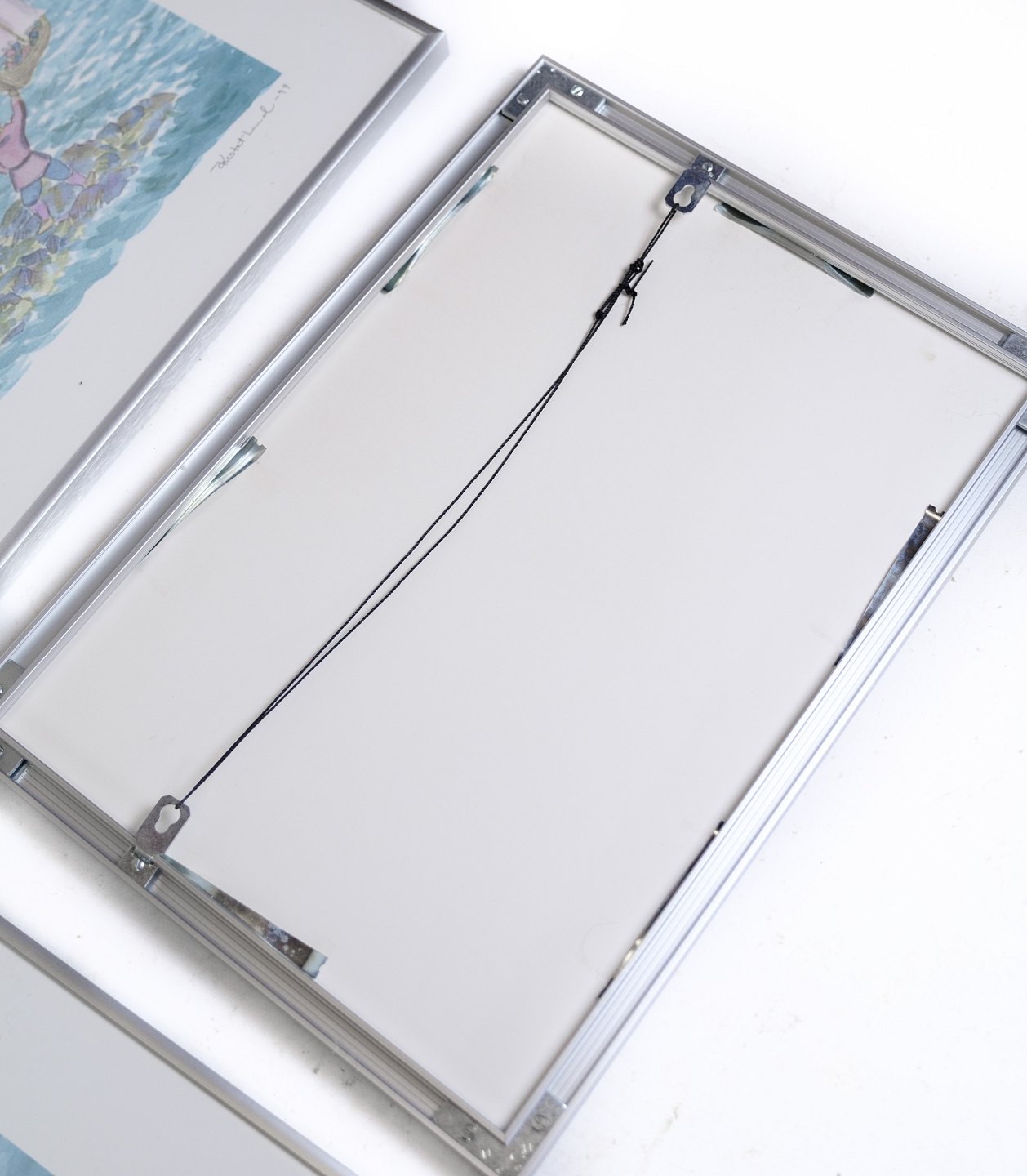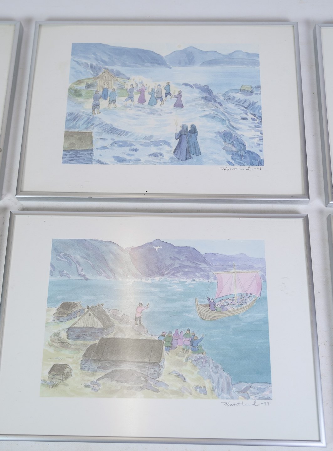 Sæt af 6 billeder fremstillet ved tryk med sølvfarvet ramme med motiv af grønlandsk koloni, som er lavet af Kistat lund (1944-2017). Prisen er for alle 6 billeder.