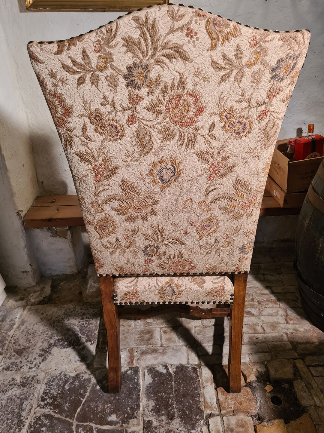 Flot gammel kongestol i eg og stofbeklædt ryg og sæde. Fremstår stabil og velholdt uden nævneværdige brugsspor.