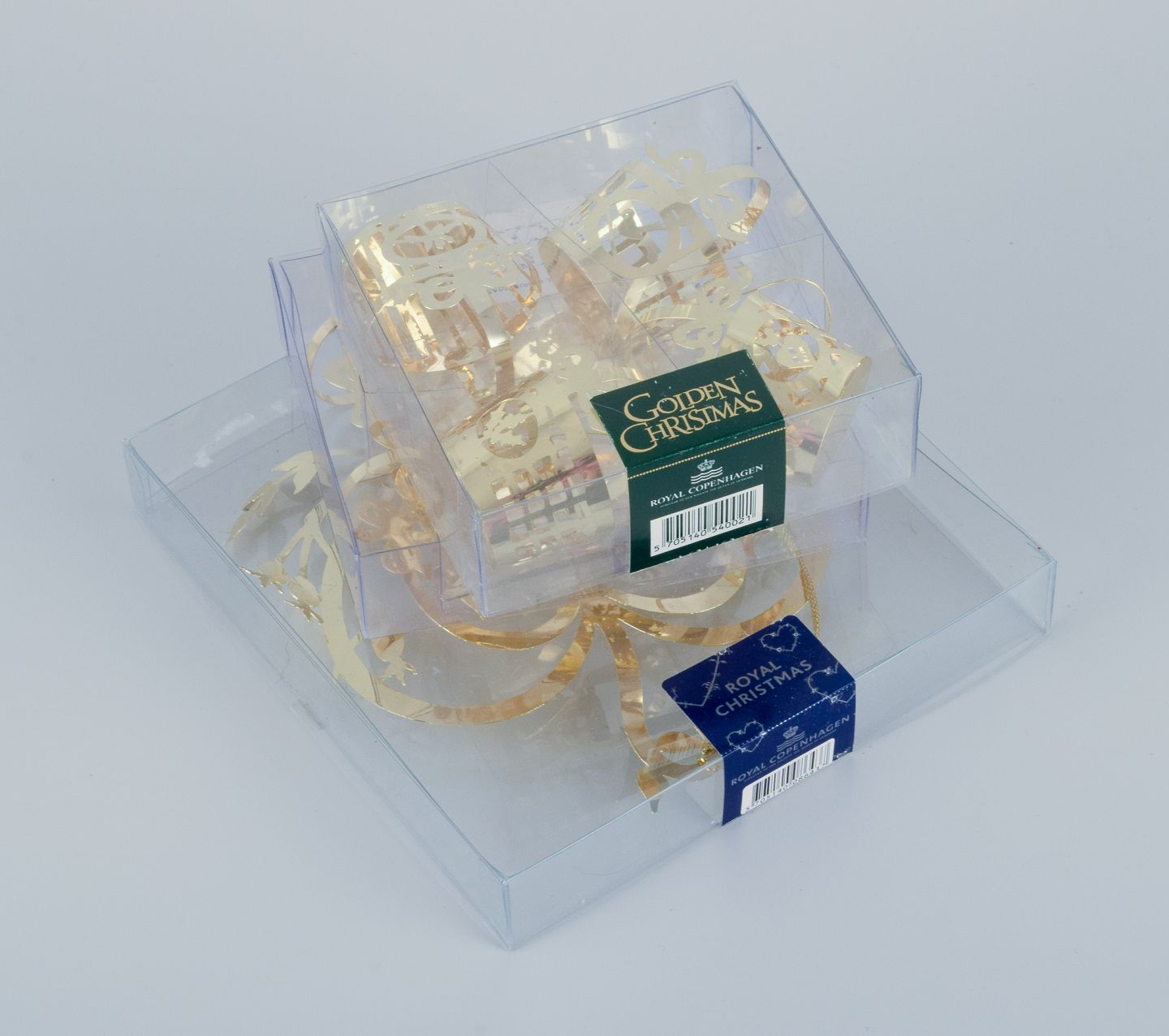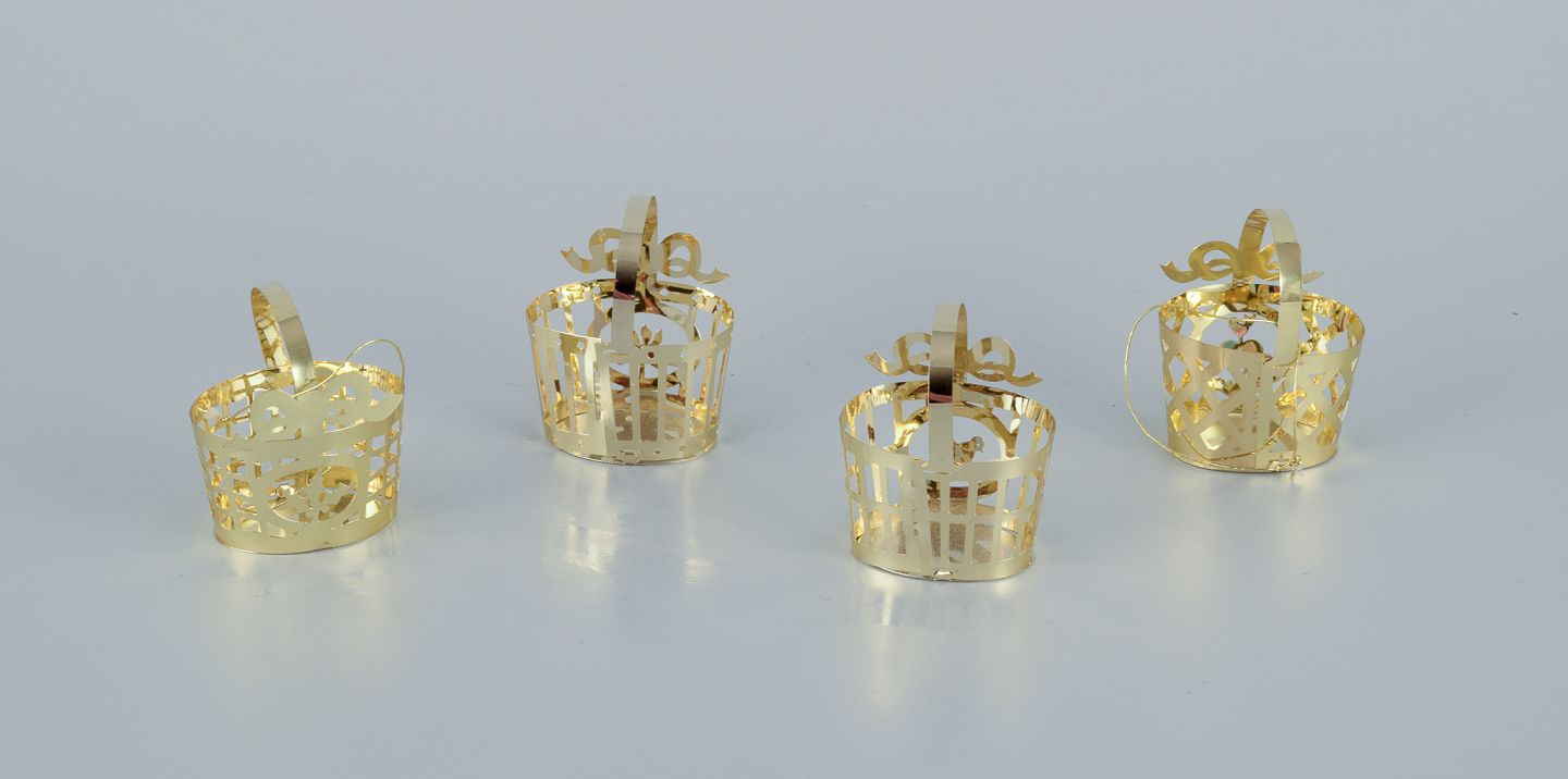 Royal Copenhagen "Royal Christmas". Set of nine brass Christmas ornaments for hanging on the Christmas tree and in the window.