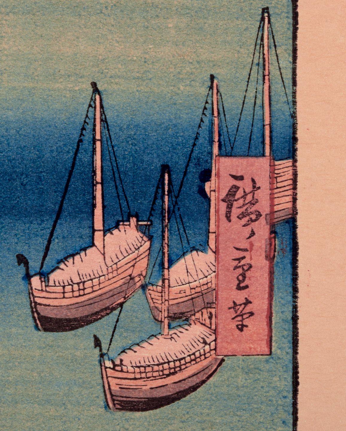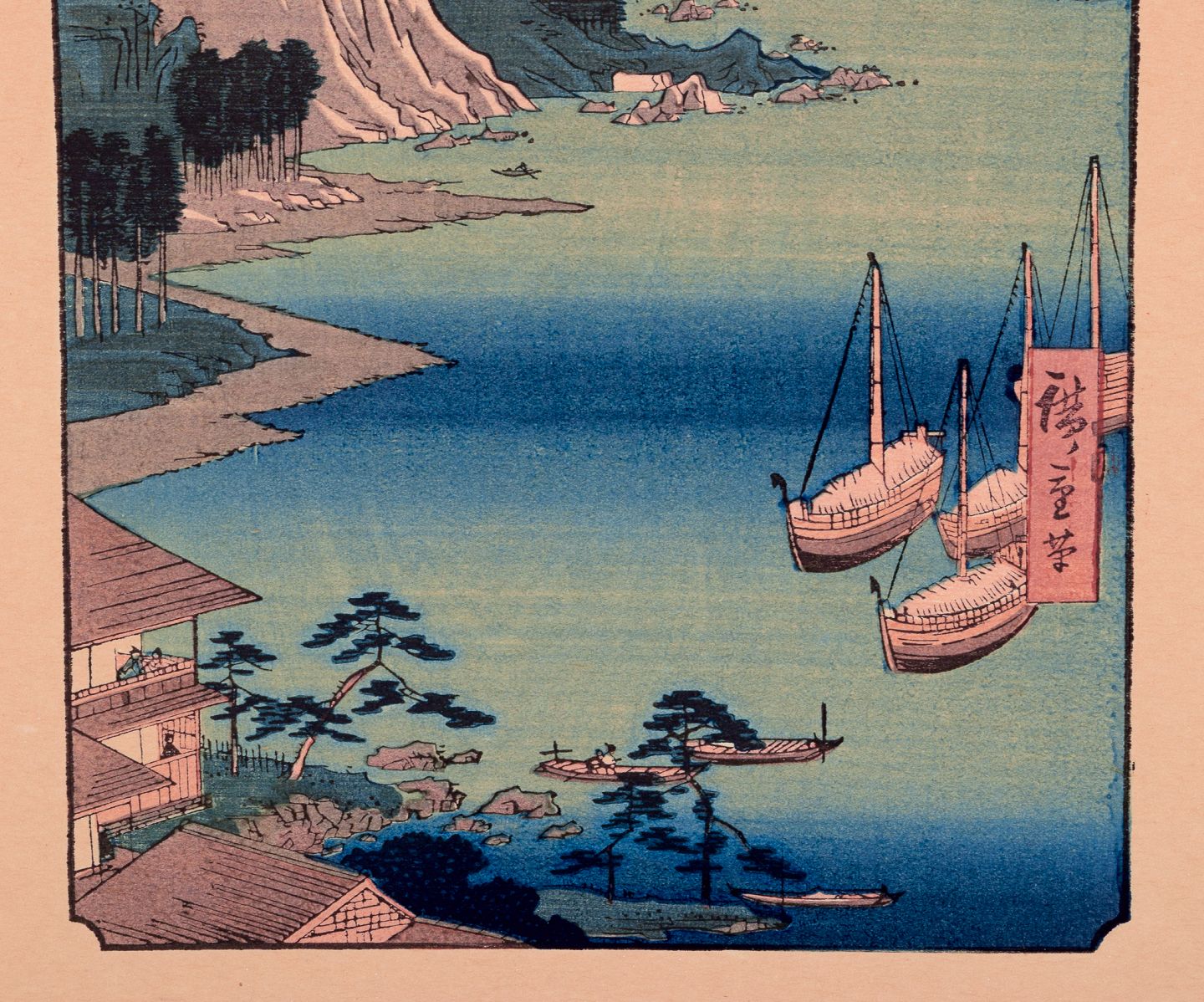 Japansk træsnit på japanpapir. Landskab med sejlbåde på vandet.