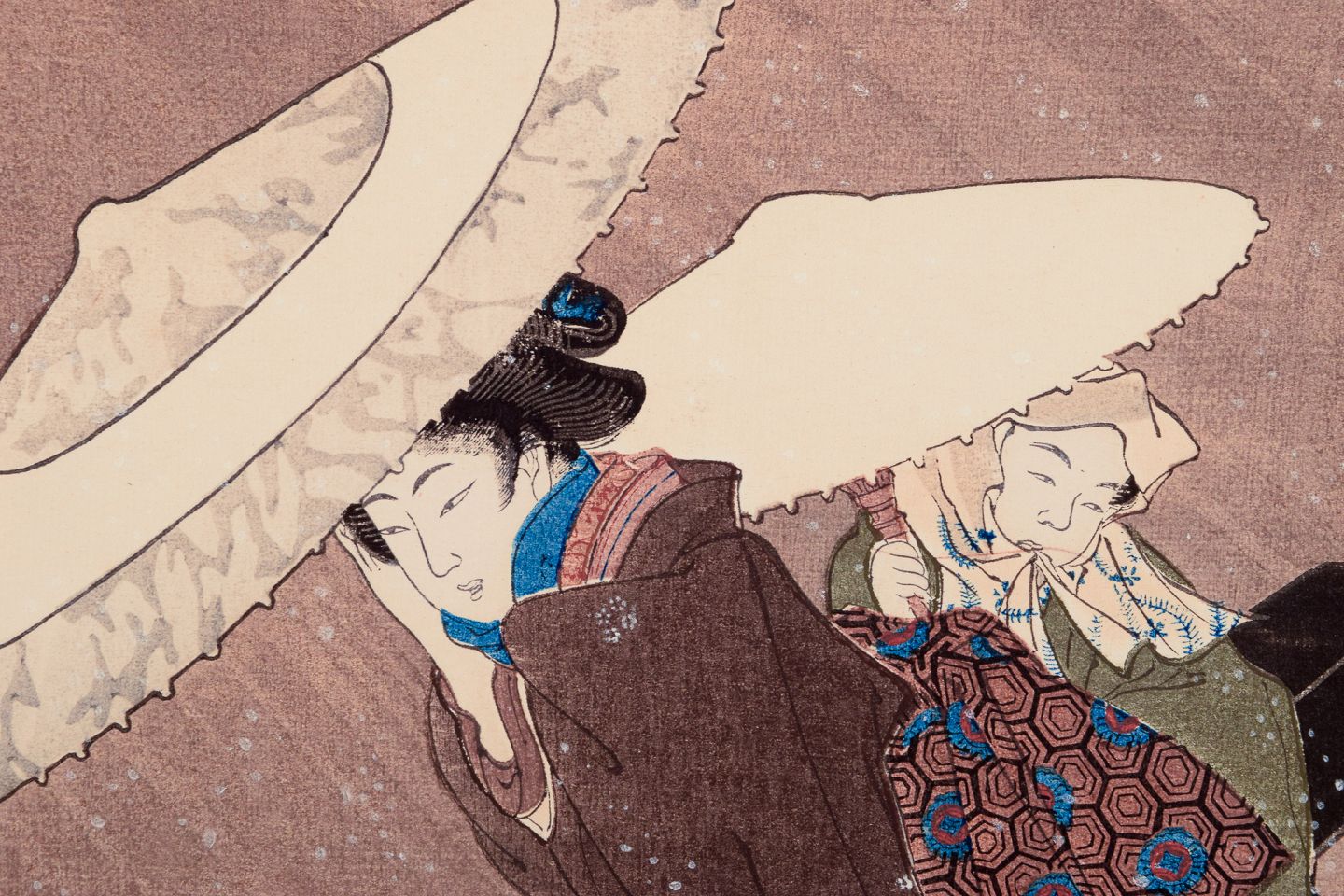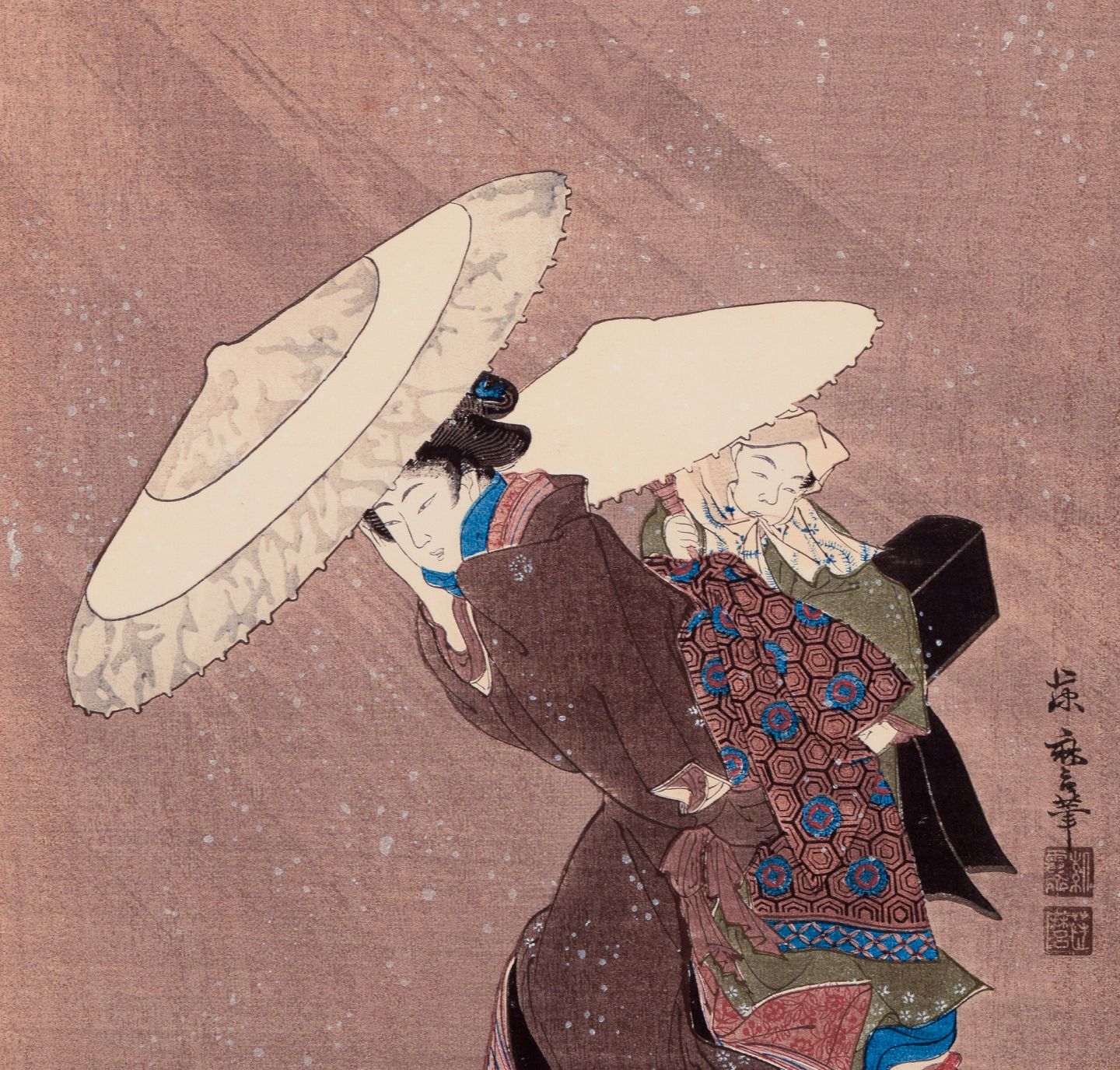 Fujimaro Kitagawa (1790-1850). Træsnit på japanpair. Snelandskab med kvinde I traditionelle klæder bærende på barn.