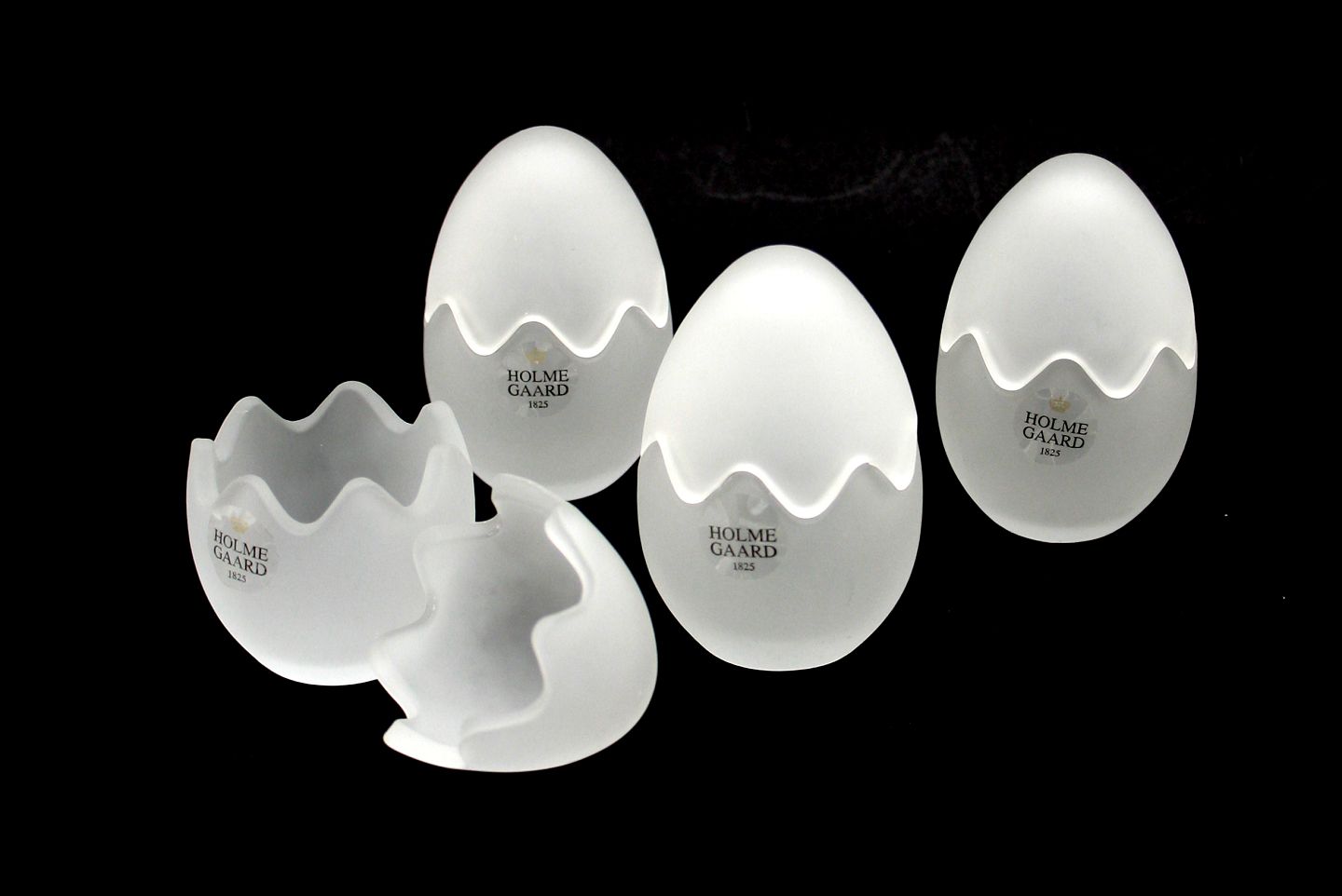 Holmegaard, Æggebæger med låg i matteret glas. Højde 8,5 cm. Diameter 5,5 cm. Pris for sæt på 4 stk: 275 kr.