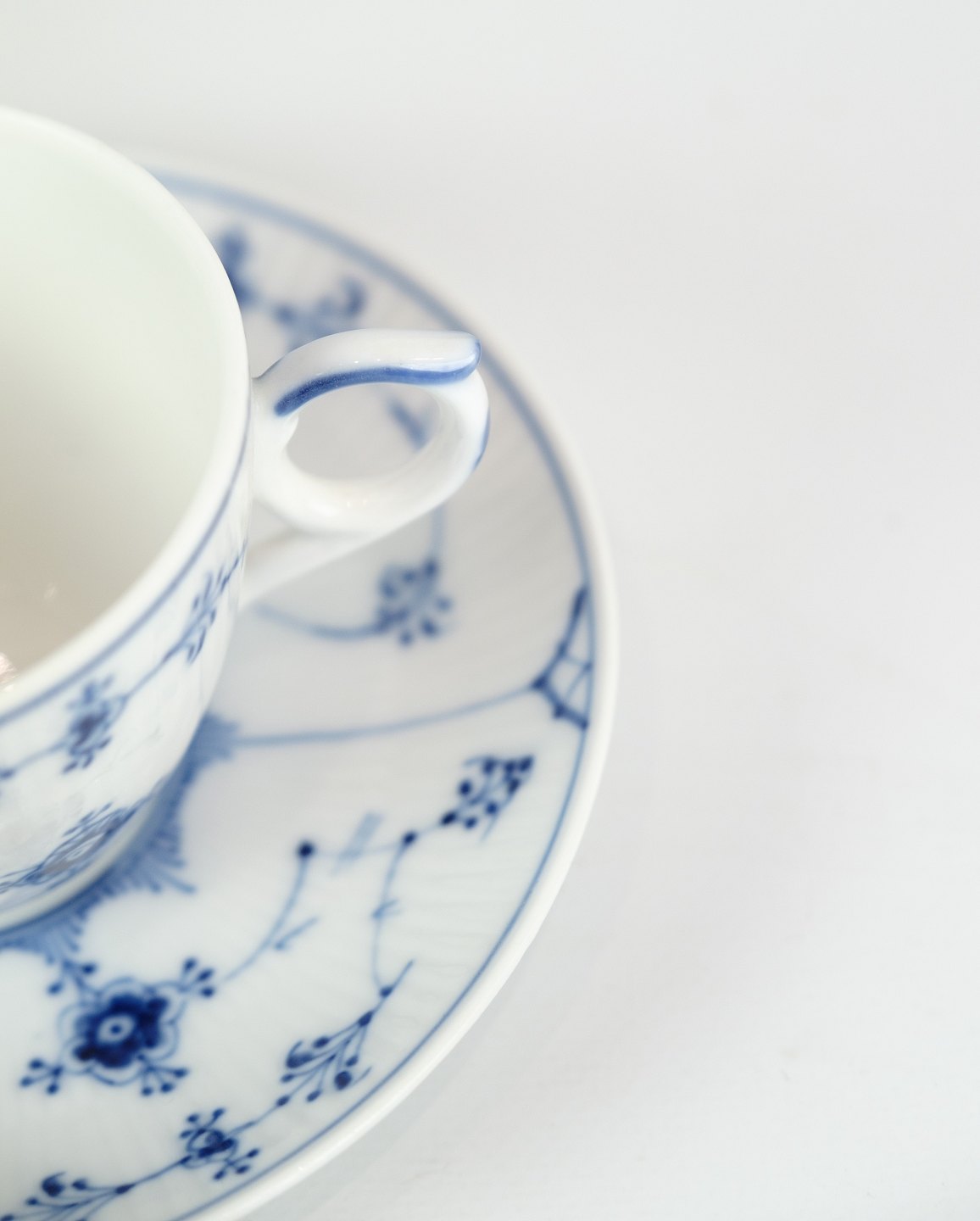 Royal Copenhagen Musselmalet Riflet er en ikonisk serie af porcelæn, der har fortryllet generationer med sit tidløse design. Den store kaffekop i denne serie, med dekorationnummer 1/79 med tilhørende underkop nr. 79-82, som er en skøn tilføjelse til enhver samling af porcelæn.