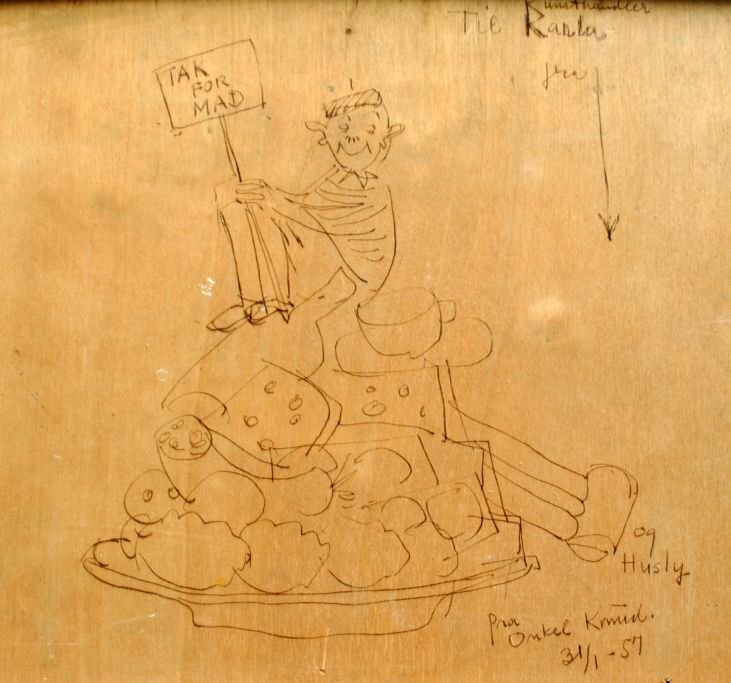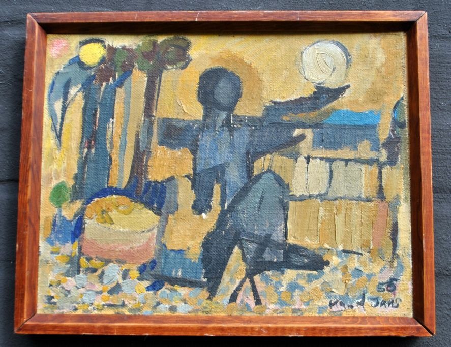 Jans, Knud Henning (1916 - 1985) Danmark: Komposition. Olie på træ. Signeret 1956. 24 x 31 cm.  Indrammet: 26 x 33 cm.  Verso tegning af kunstneren, hvor han takker Kundthandler Kanla for mad og husly, signeret Onkel Knud 31.1.1957.