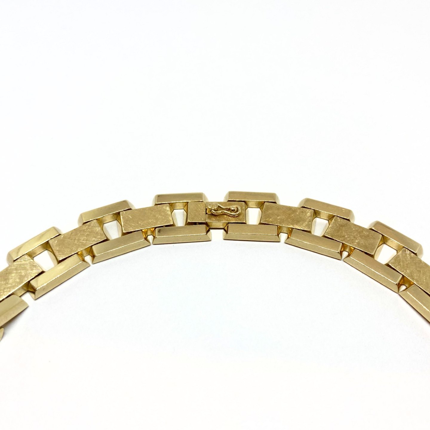 Guldvirke; Halskæde i blokmønster af 14 kt. guld. Med matteret mønster på leddene i midten af kæden. Monteret med kasselås samt sikkerhedslås. Stemplet "Guldvirke 585".