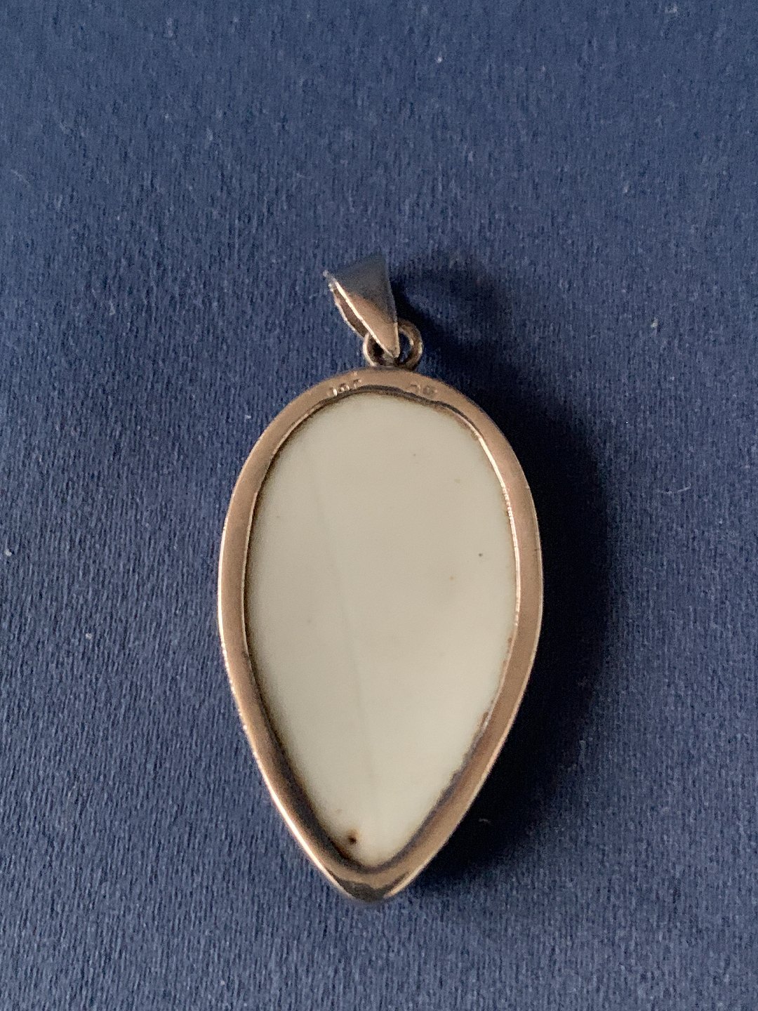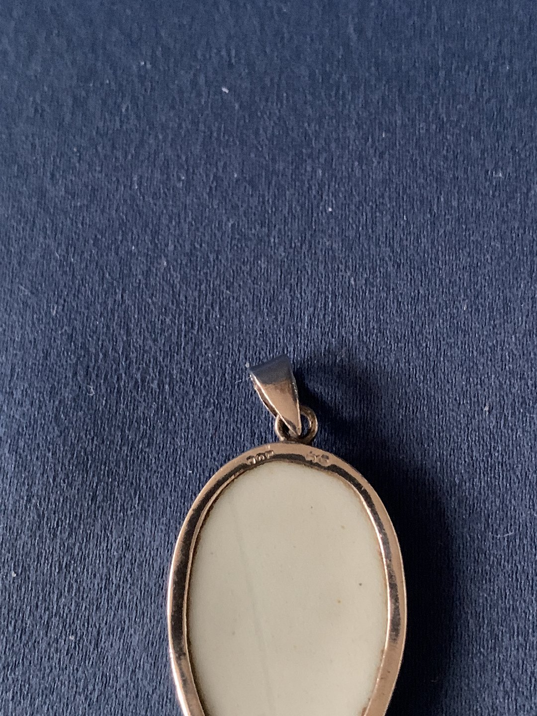 Beautiful pendant in sterling silver, with an insert of beautifully painted porcelain. The pendant is suitable for hanging on a thin silver chain, where it will be a beautiful necklace for almost any occasion.