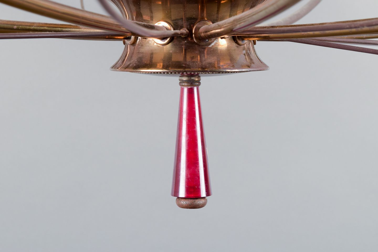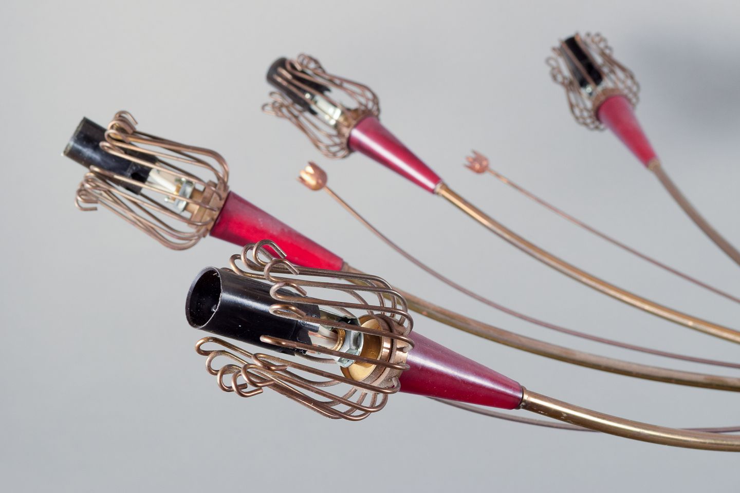 Emil Stejnar for Rupert Nikoll. Kolossal lysekrone til 16 pærer, messing og bordeauxfarvet plast blomsterknopper.