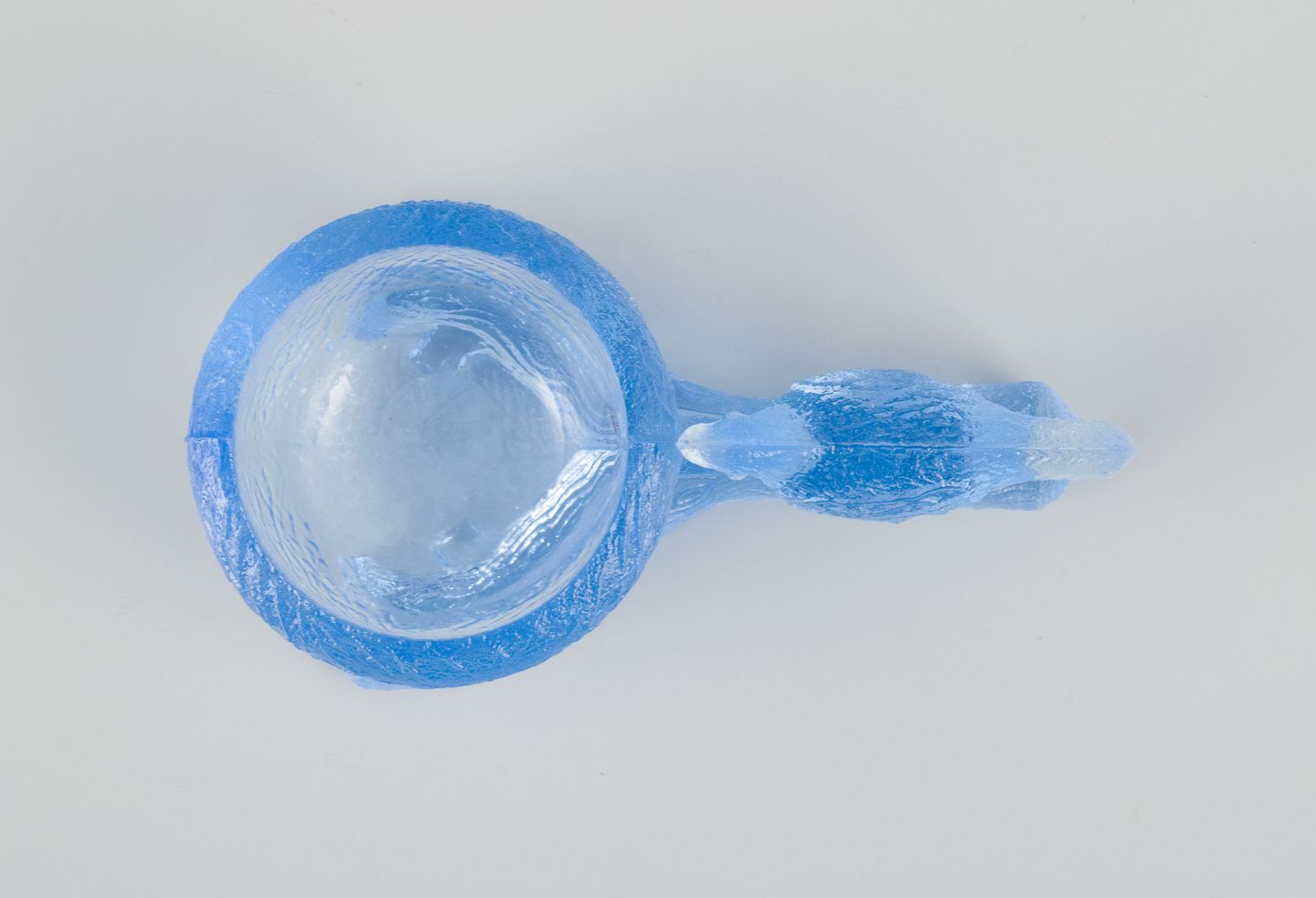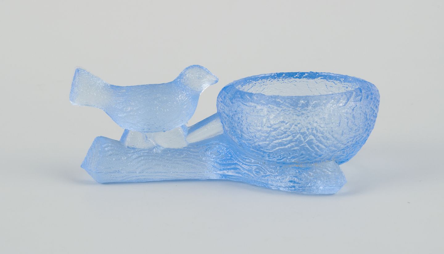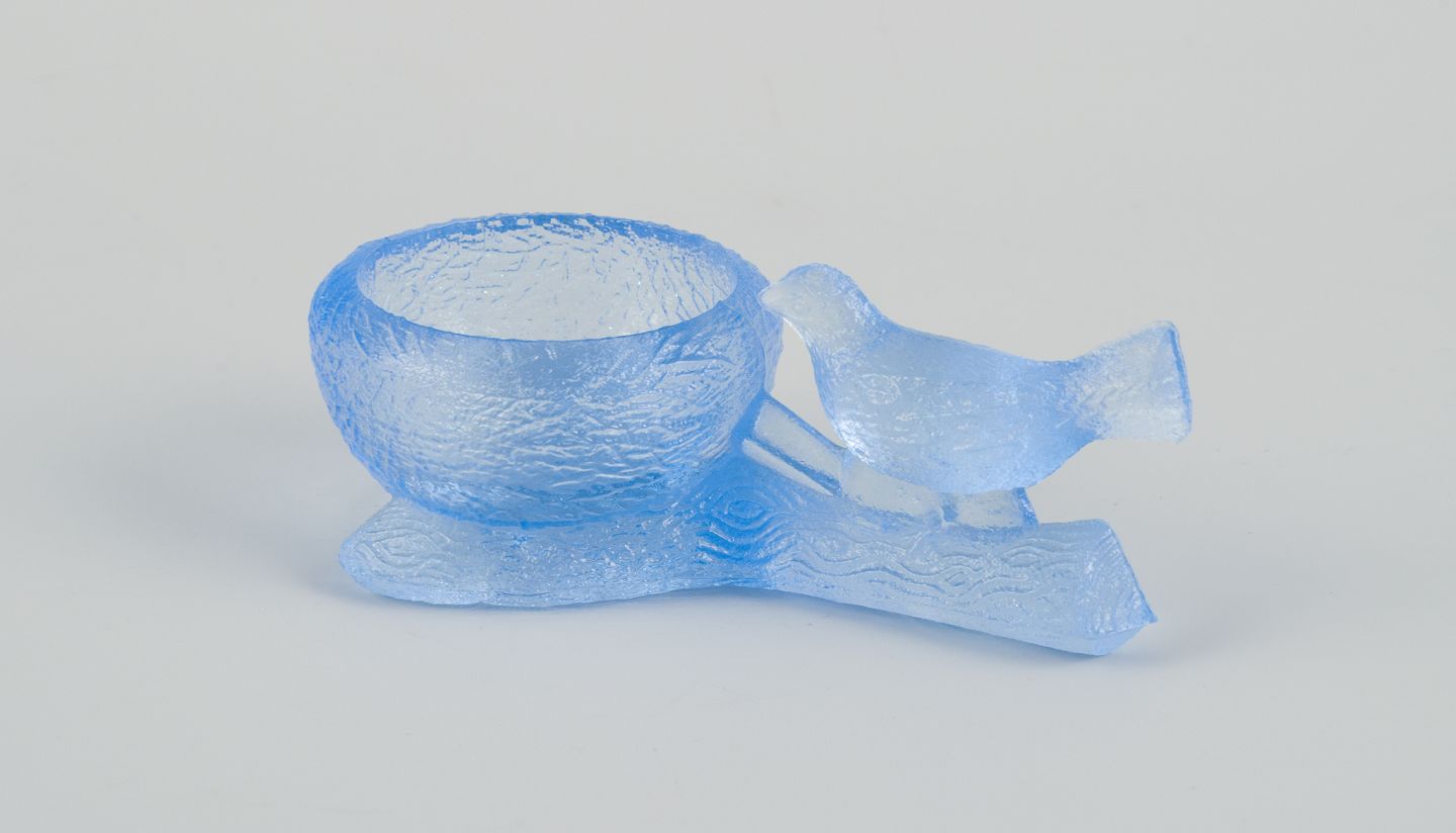 To saltkar med fugle i farvet glas. Blåt håndlavet glas.