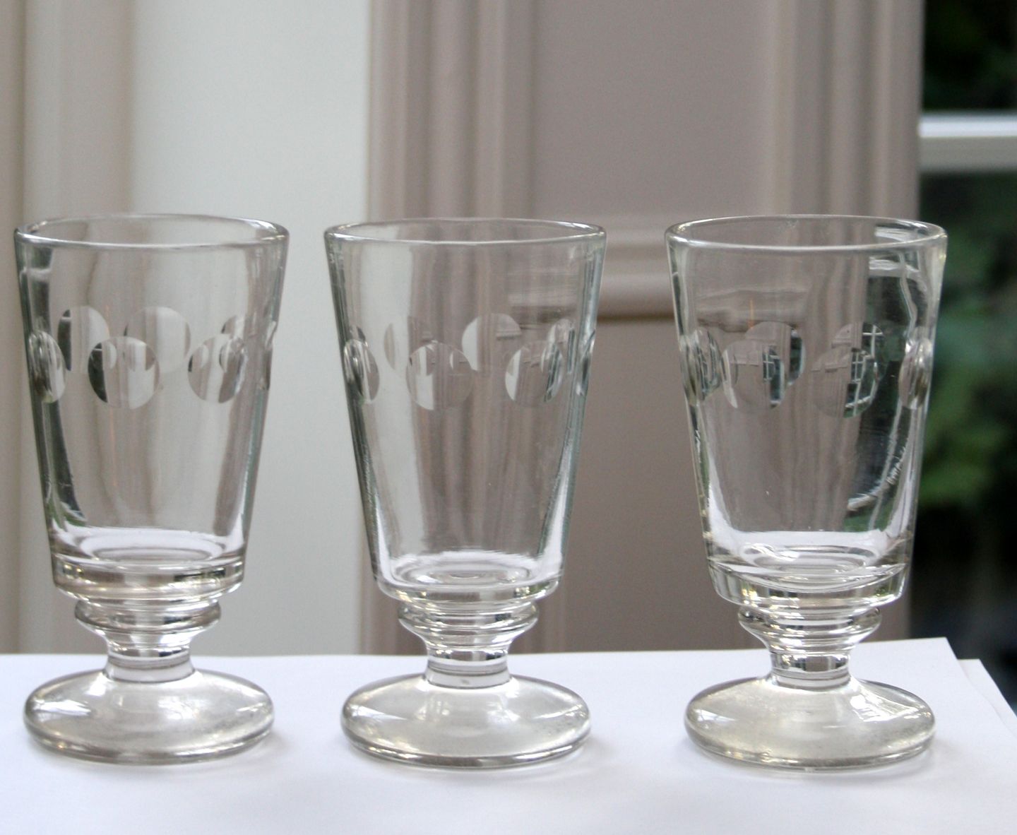 Antagelig Holmegaard, er med i Holmegaards katalog 1900 som nr. 99. Toddyglas tykvægget glas med blankslebne kugler på kummen. Brugsslid under foden, se ekstra foto. Pris:: 450 kr. for alle 3.