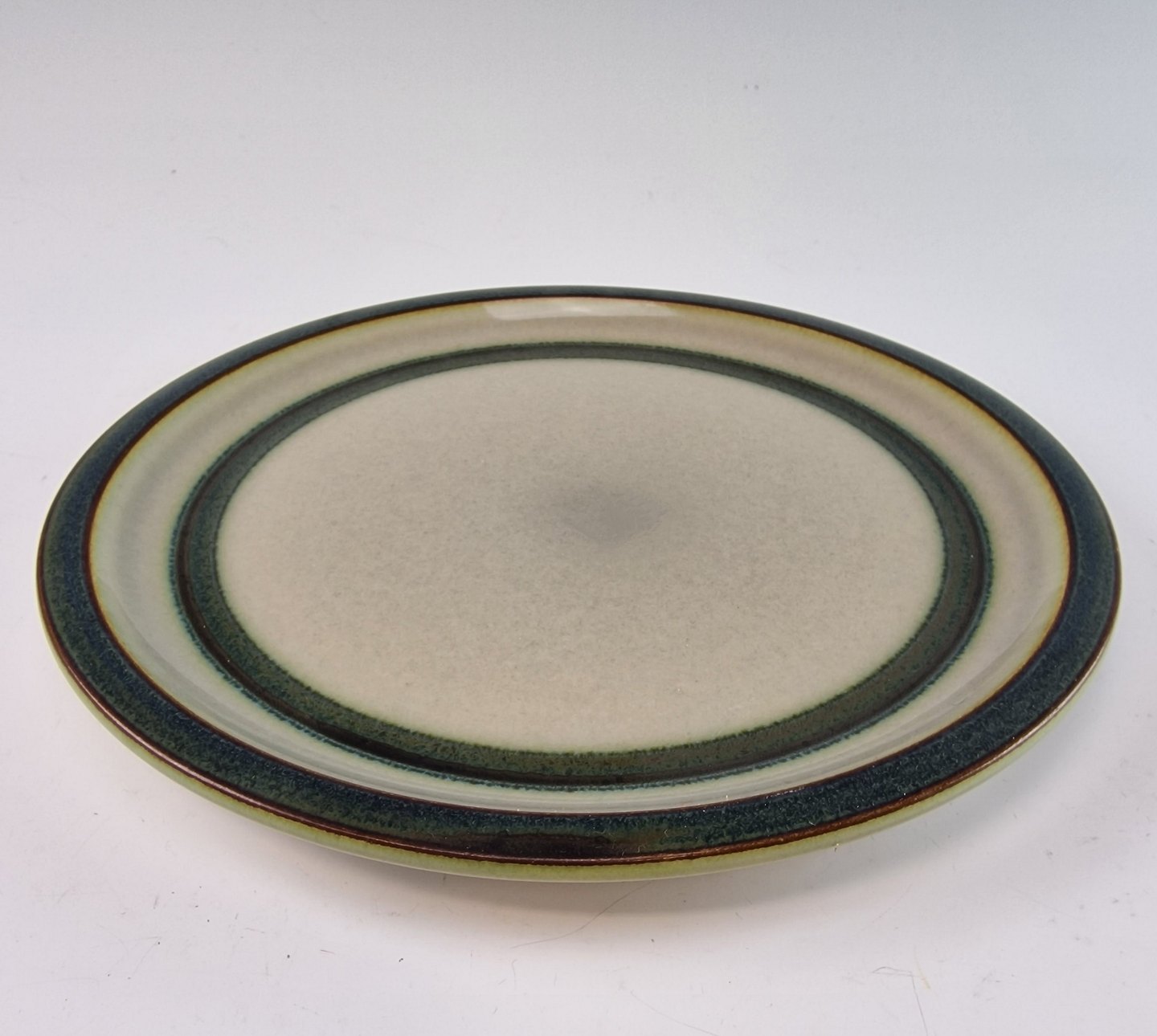 Stellet Tema er af stentøj, glaseret med lys grå og dekoreret med kanter af grønne og brune farver