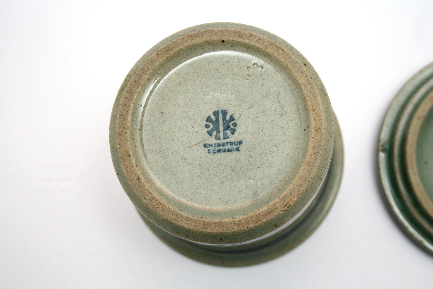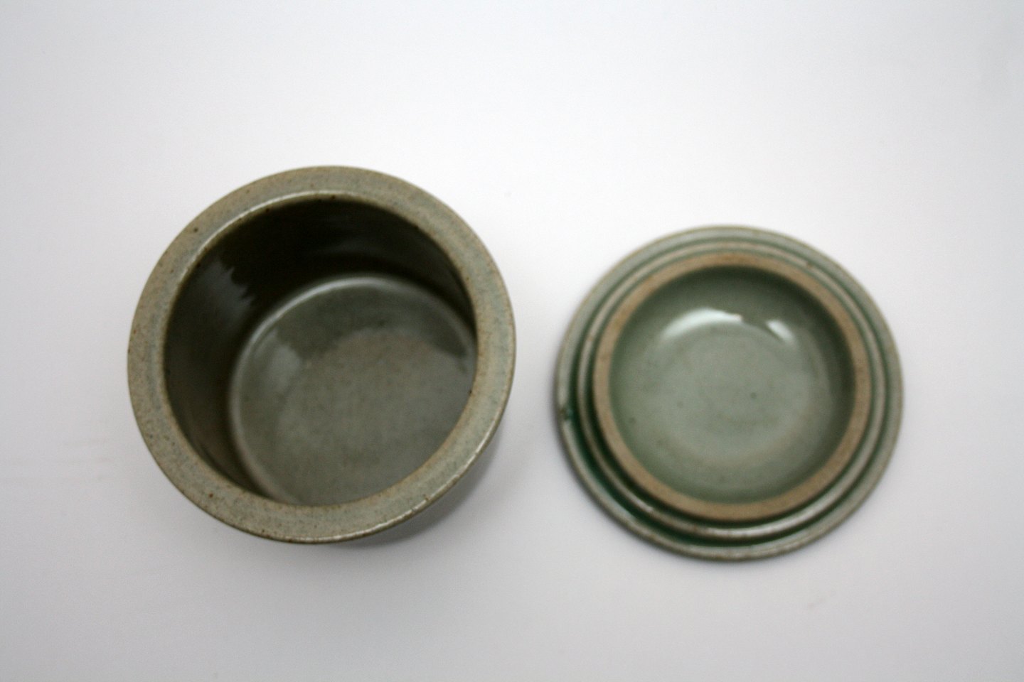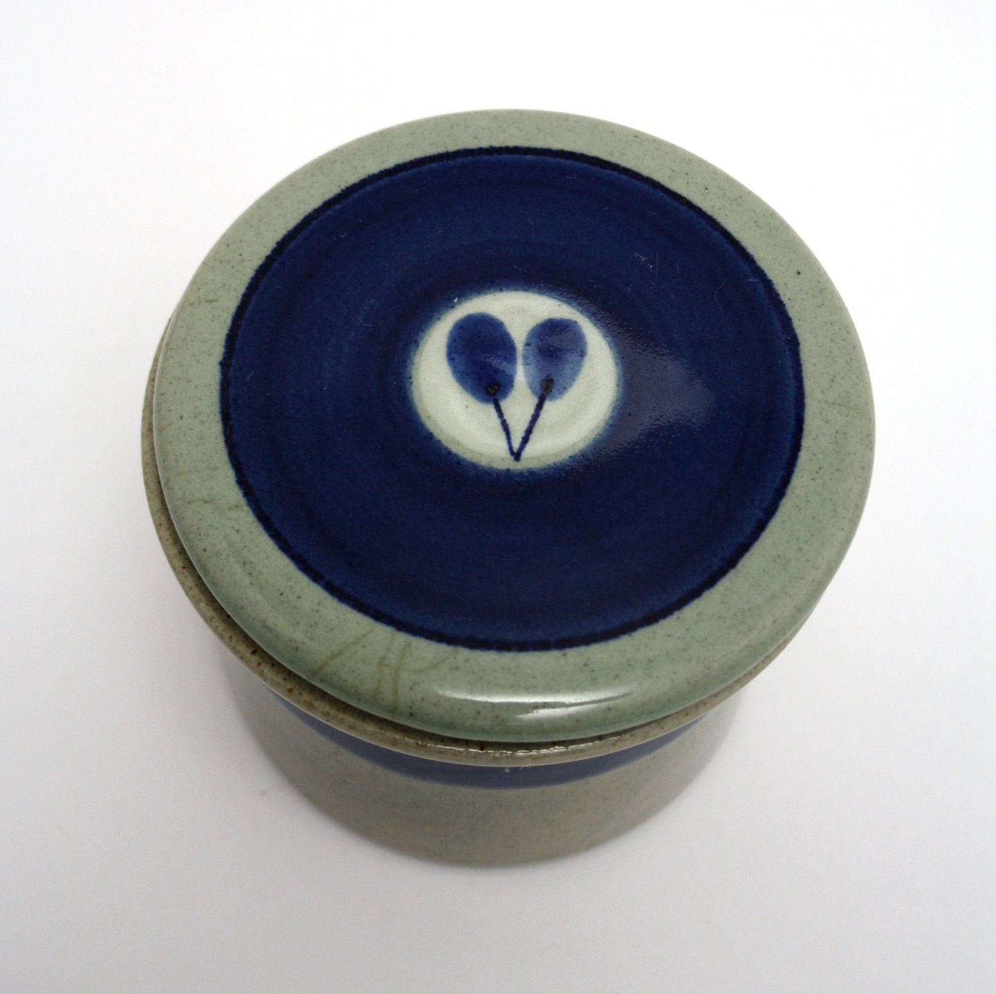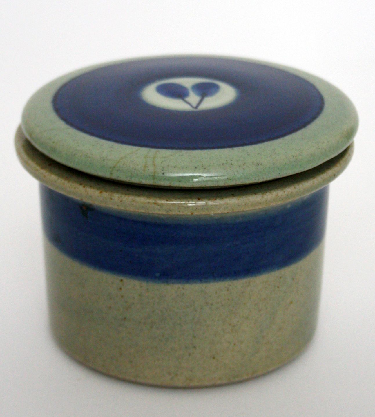 Knabstrup, Kattegat stentøjsstel grå glasur med blå kant og bærmotiv. Designet af Inger Persson 1975. Sukker eller marmeladeskål med låg. Diameter 11 cm. Højde 8 cm. Pris: 150 kr. stk. Lager: 1