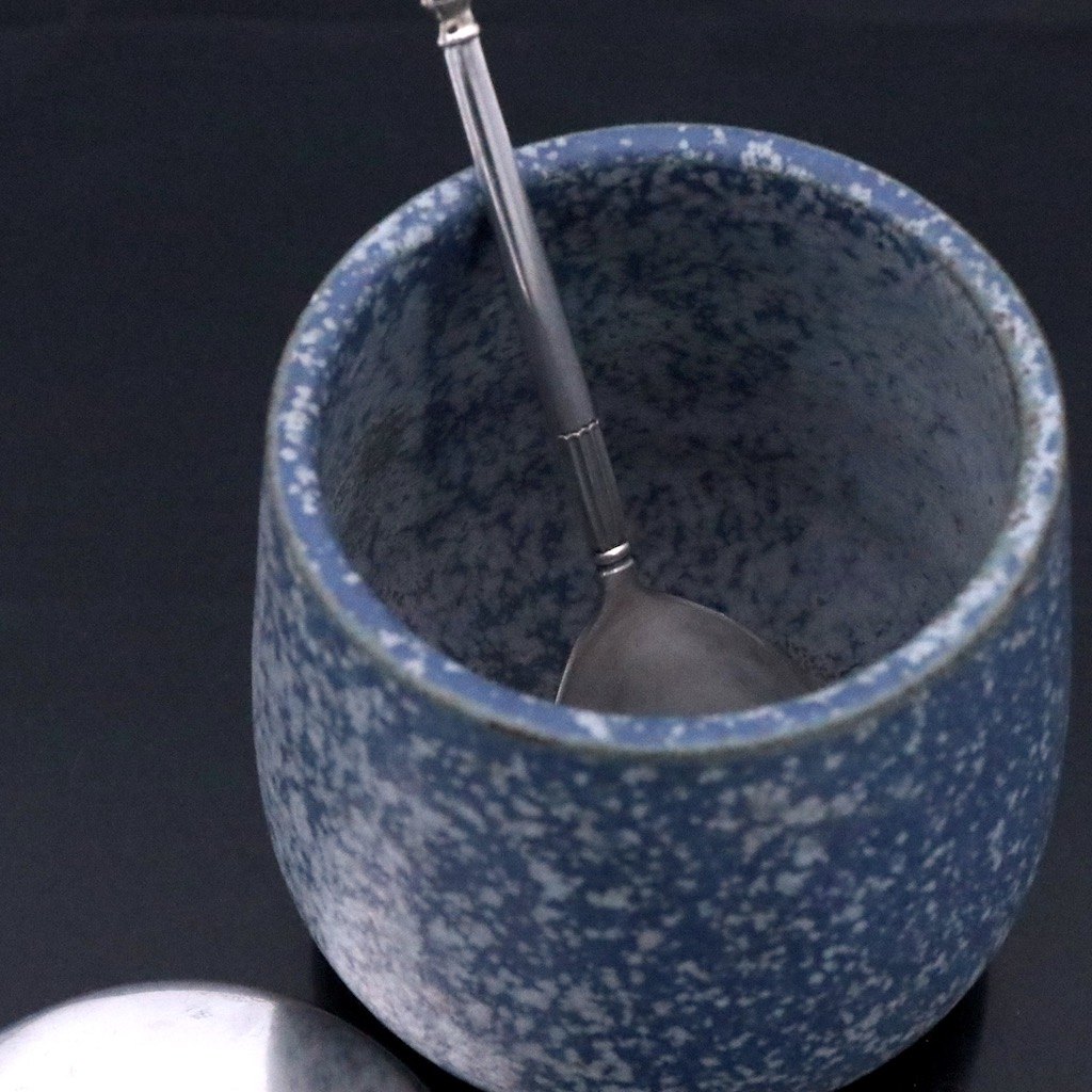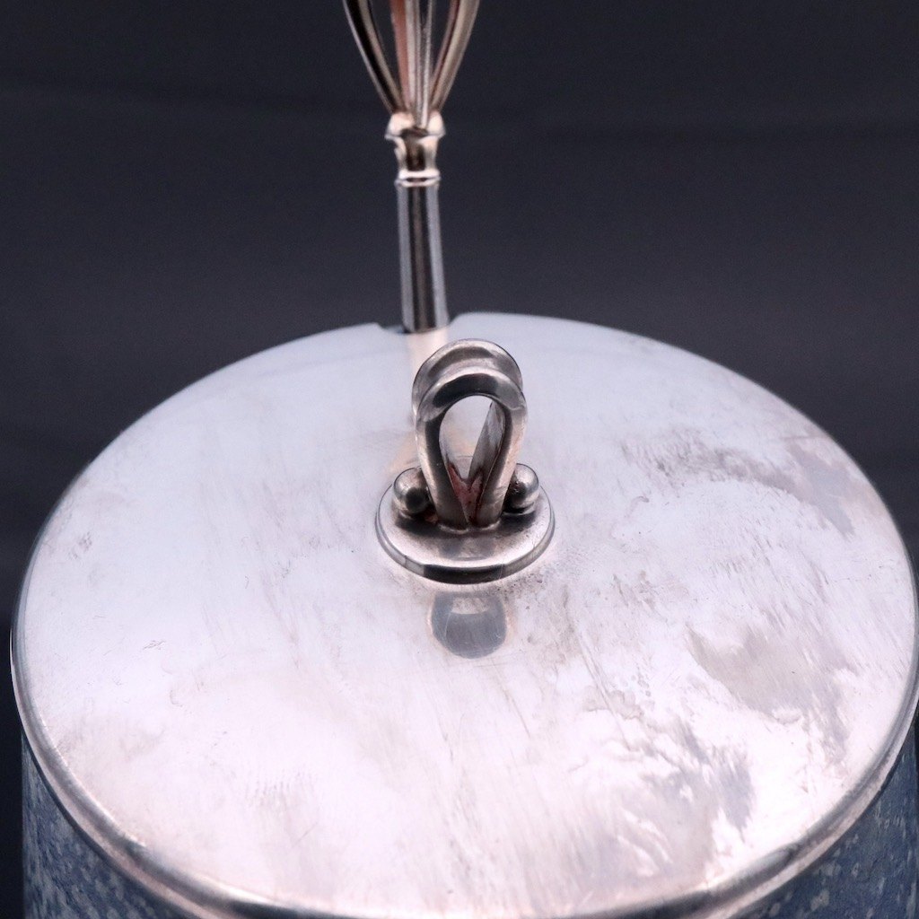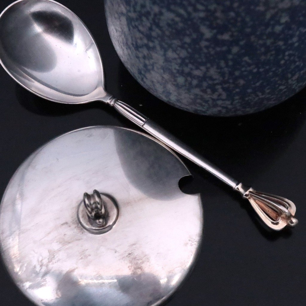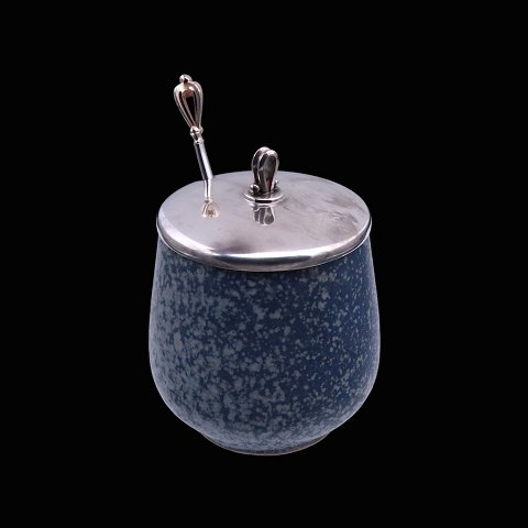 Arne Bang - E. Dragsted. Krukke i stentøj med låg og ske i sterling sølv.