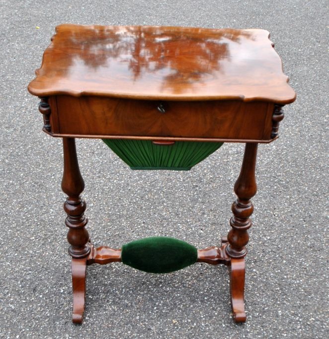 Dansk mahogni sybord, 19. årh. Med udtrækkelig skuffe, hvorunder flere små rum. Øverste plade kan skubbes. Med skuffe til garn. H: 77 cm. D.: 44 cm. B.: 57 cm.