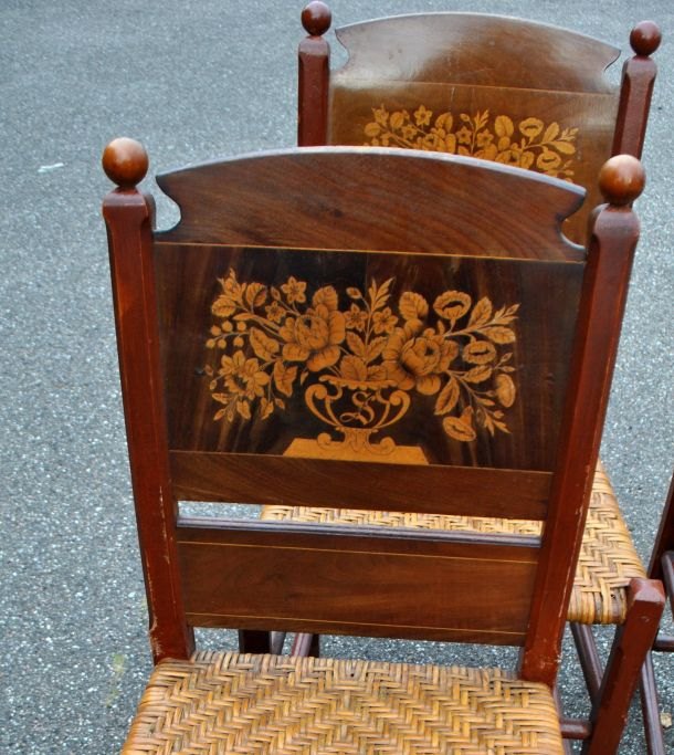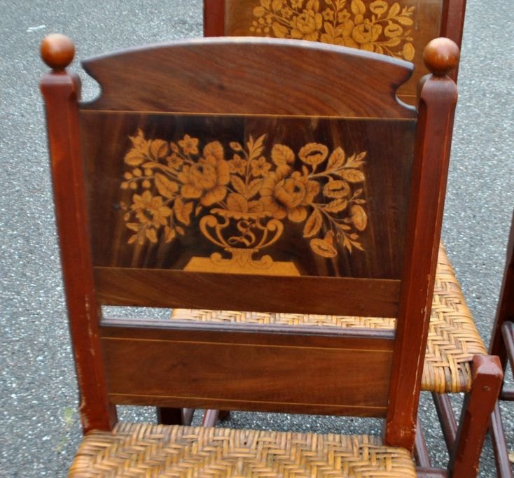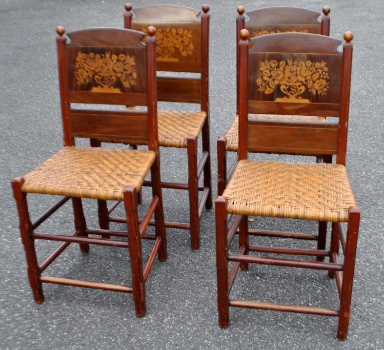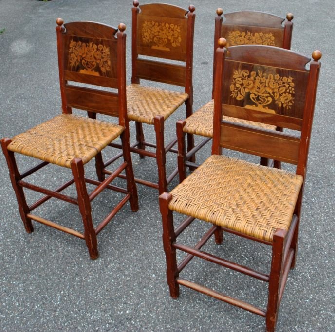 Sæt på 4 salonstole, Schlesvig - Holsten, 19. årh. I bemalet fyrretræ med ryg i mahogni med intarsia. intarsia i form af blomster og bogstavet: S. Sæde i flet. H.:96 cm. D.: 40 cm. D.: 45 cm.