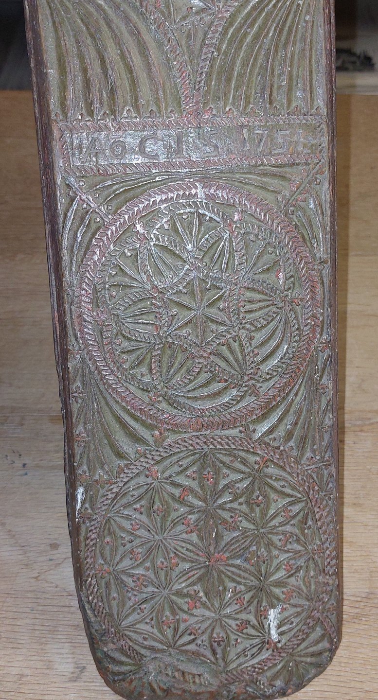 Manglebrædt skåret I træ. Rigt dekoreret incl. produktionsåret 1751. Original bemalet. Brugsspor, som det fremgår af fotos. L. 61,5 cm.