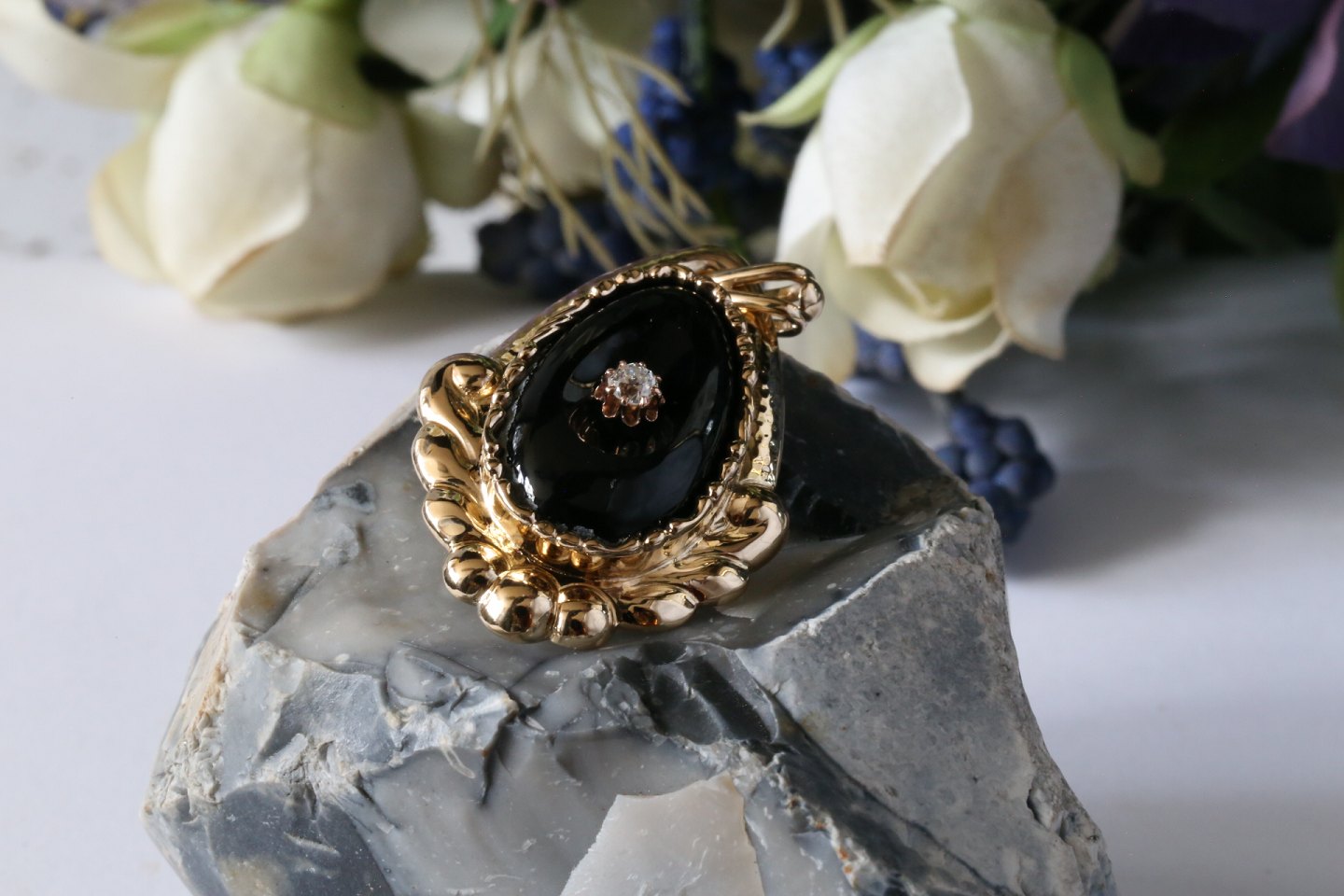 Smukt vedhæng i 14 karat guld, med brilliant og sort onyx. På forsiden af vedhænget er en flot brilliant, indlagt i en smuk fatning. På bagsiden kan rammen tages af, så der kan indsættes et lille billede. Med andre ord, et klassisk eksklusivt antikt smykke der vil passe perfekt i en guldkæde om halsen.