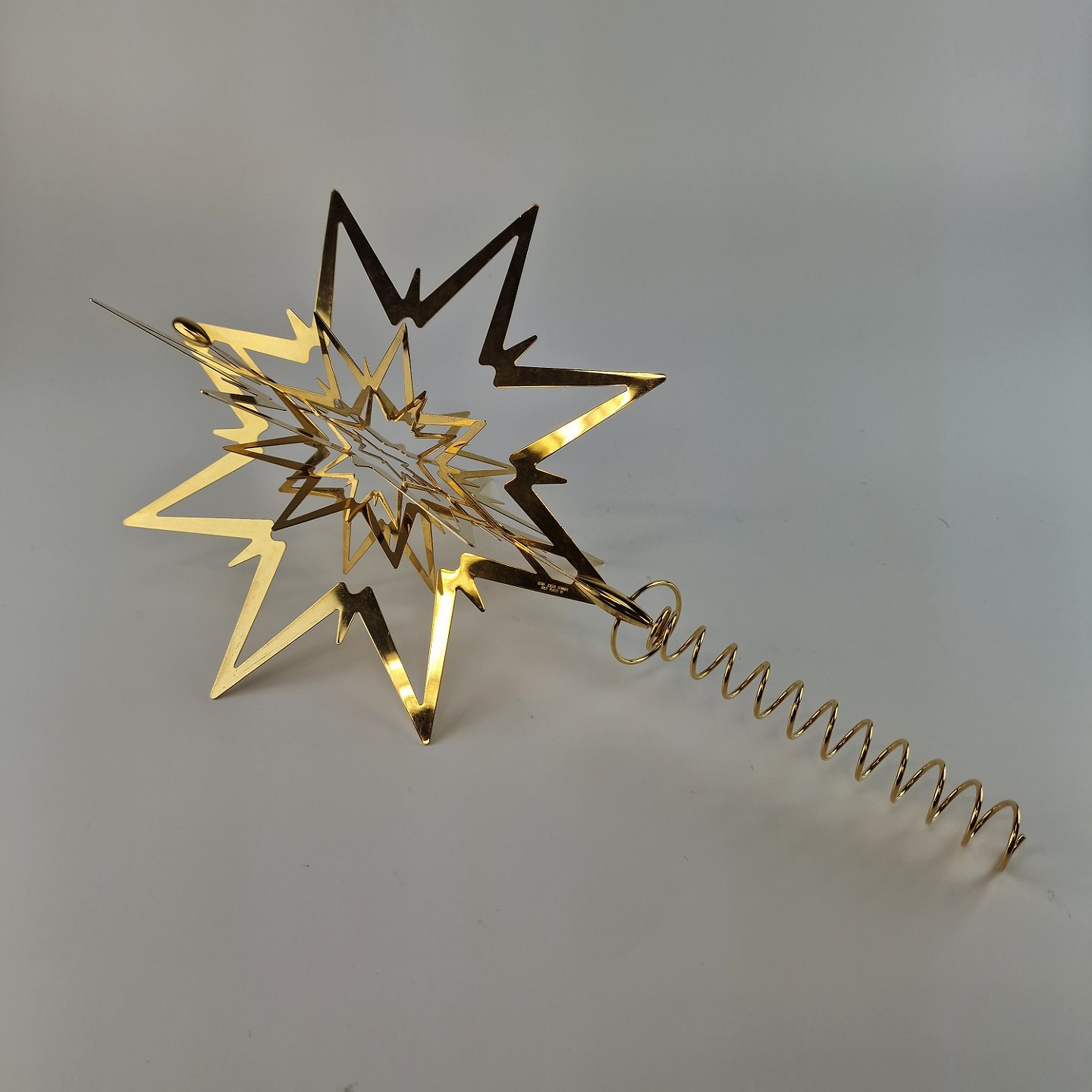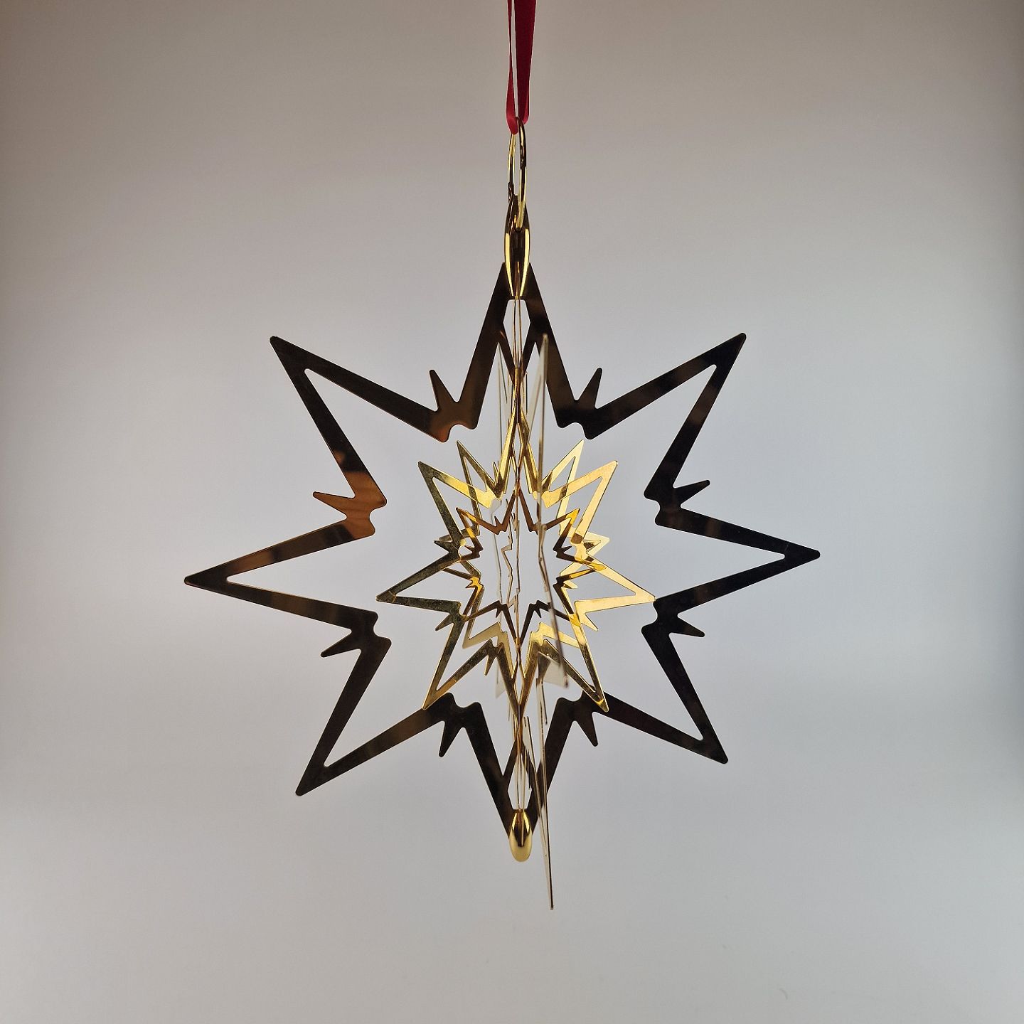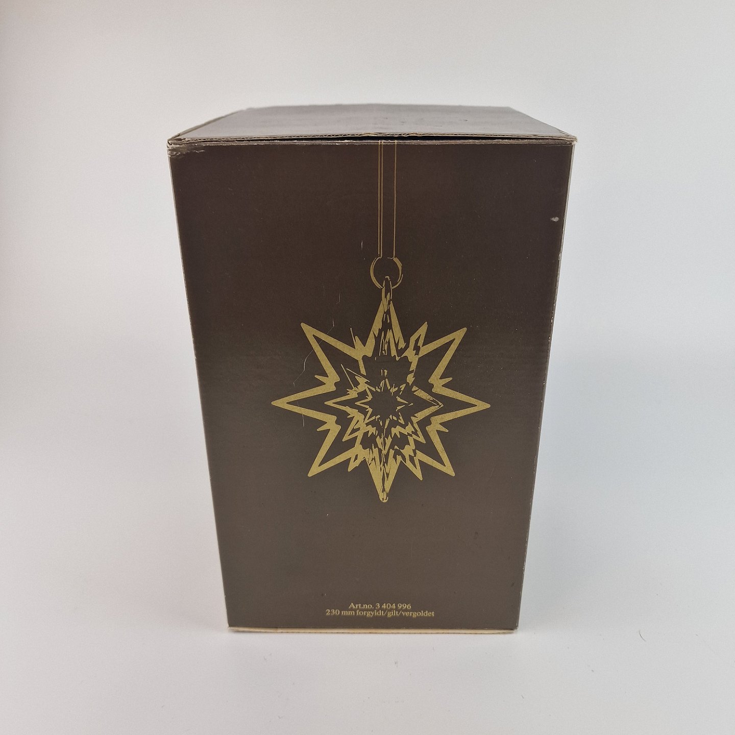 Juletræstjerne i messing belagt med 14 karat guld. Der medfølger rødt bånd til ophæng. Leveres i original æske. Model Stor