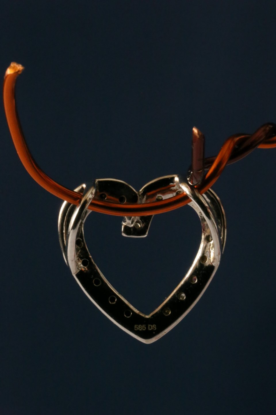 Vedhæng til kæde, hjerteformet i 14 k hvidguld, med brillanter.