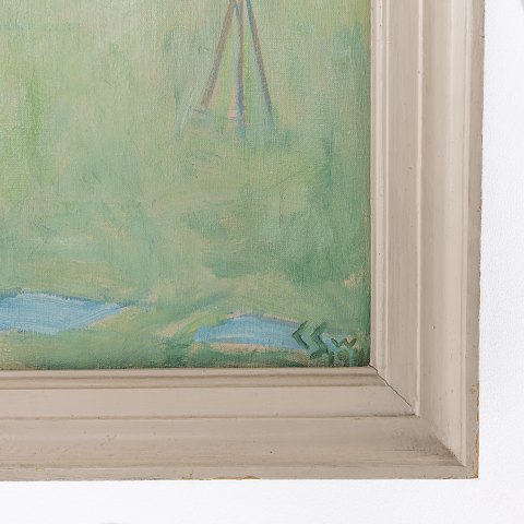 Maleri. 'Haveparti' med blå ramme fra 1944. Signeret.